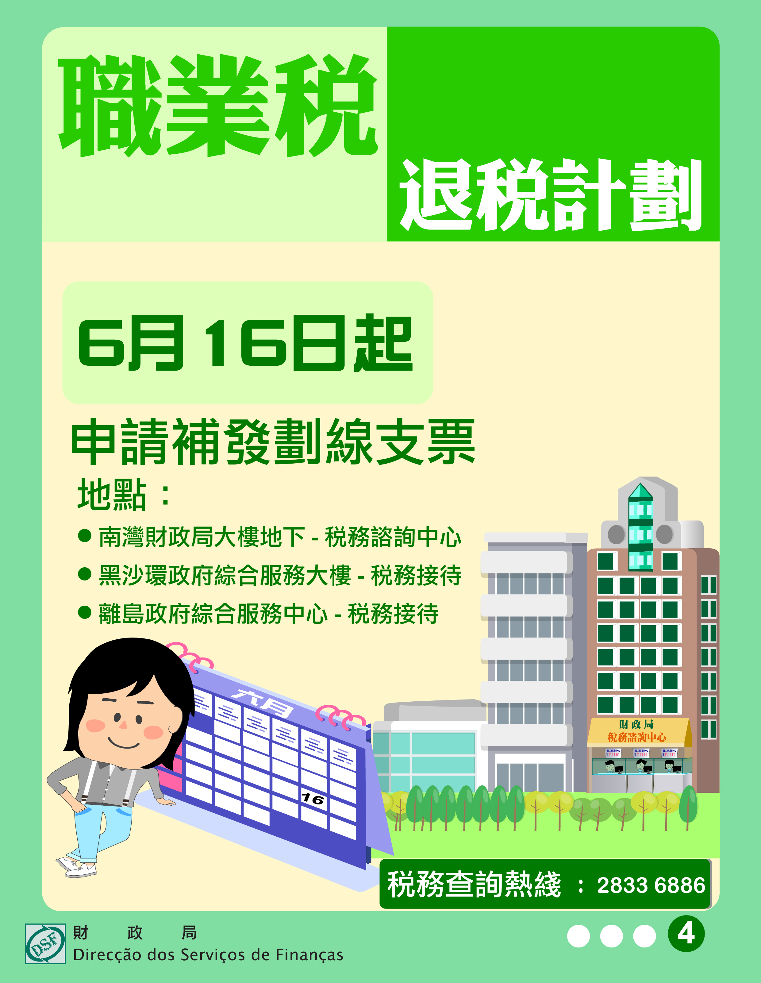 納稅人倘未如期收到2021年度職業稅退稅計劃劃線支票,又或遇遺失或損毀支票等情況,可自6月16日起到財政局各服務點申請補發支票。