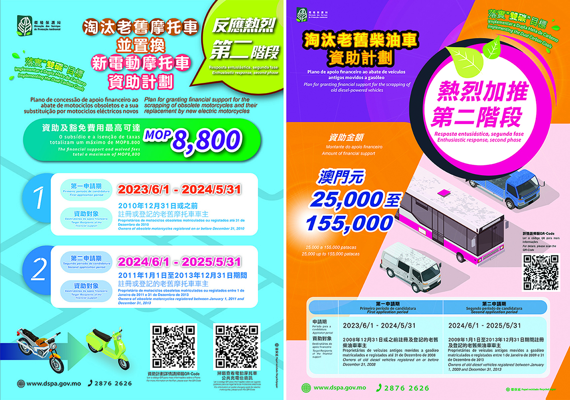 經綜合考慮成效和社會意見,特區政府自2023年6月起推出第二階段《淘汰老舊摩托車並置換新電動摩托車資助計劃》及《淘汰老舊柴油車資助計劃》並擴大資助對象範圍。預計將可進一步淘汰一批較高污染的老舊電單車及柴油車,助力儘快實現“雙碳”目標。