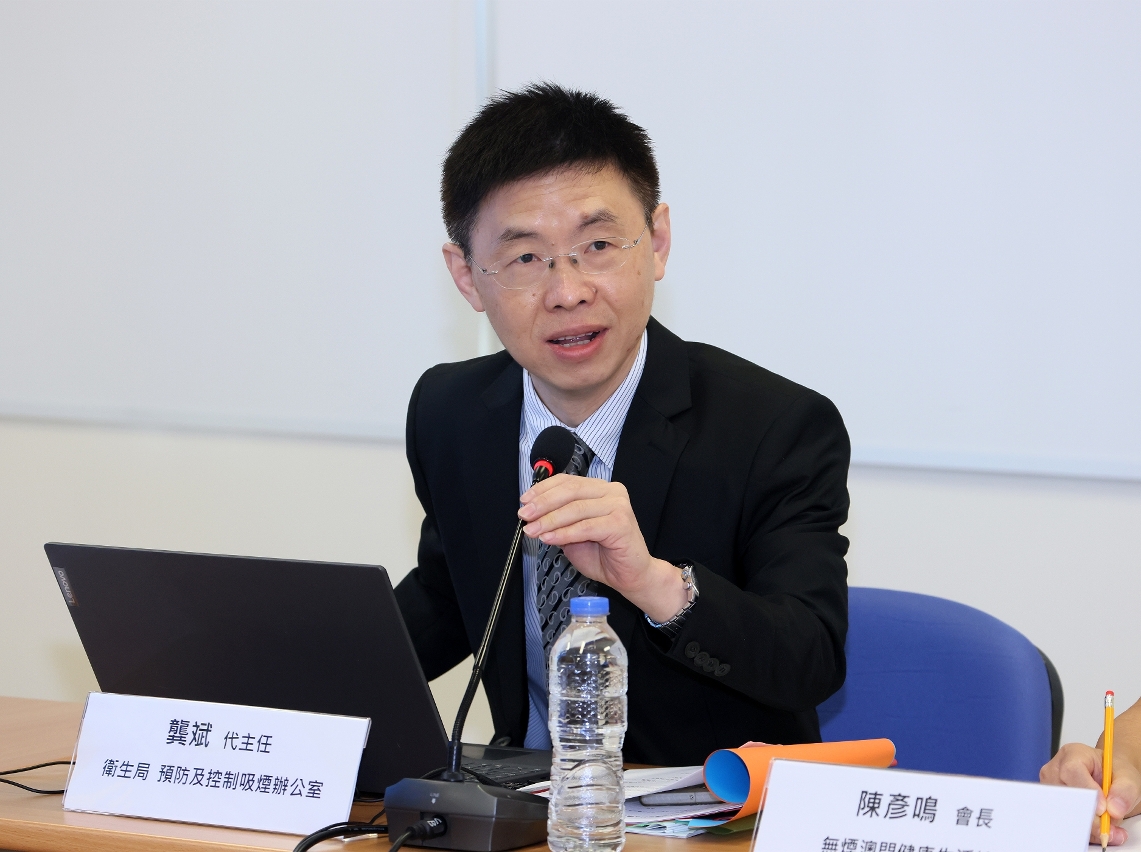 預防及控制吸煙辦公室龔斌代主任則回顧了過去1年本澳控煙工作執行情況及控煙成效;與會者分別就本澳落實控煙政策及執法、旅客對本澳控煙法律認知、監管網上違法銷售及推銷電子煙、擴大禁煙範圍及禁止邊行邊吸煙行為、加強對電子煙宣傳教育、以及合作推動煙草危害教育等進行深入的討論及交換意見;與會官方代表就所屬範疇的控煙工作也詳細回答了各種提問,現場交流氣氛熱烈。