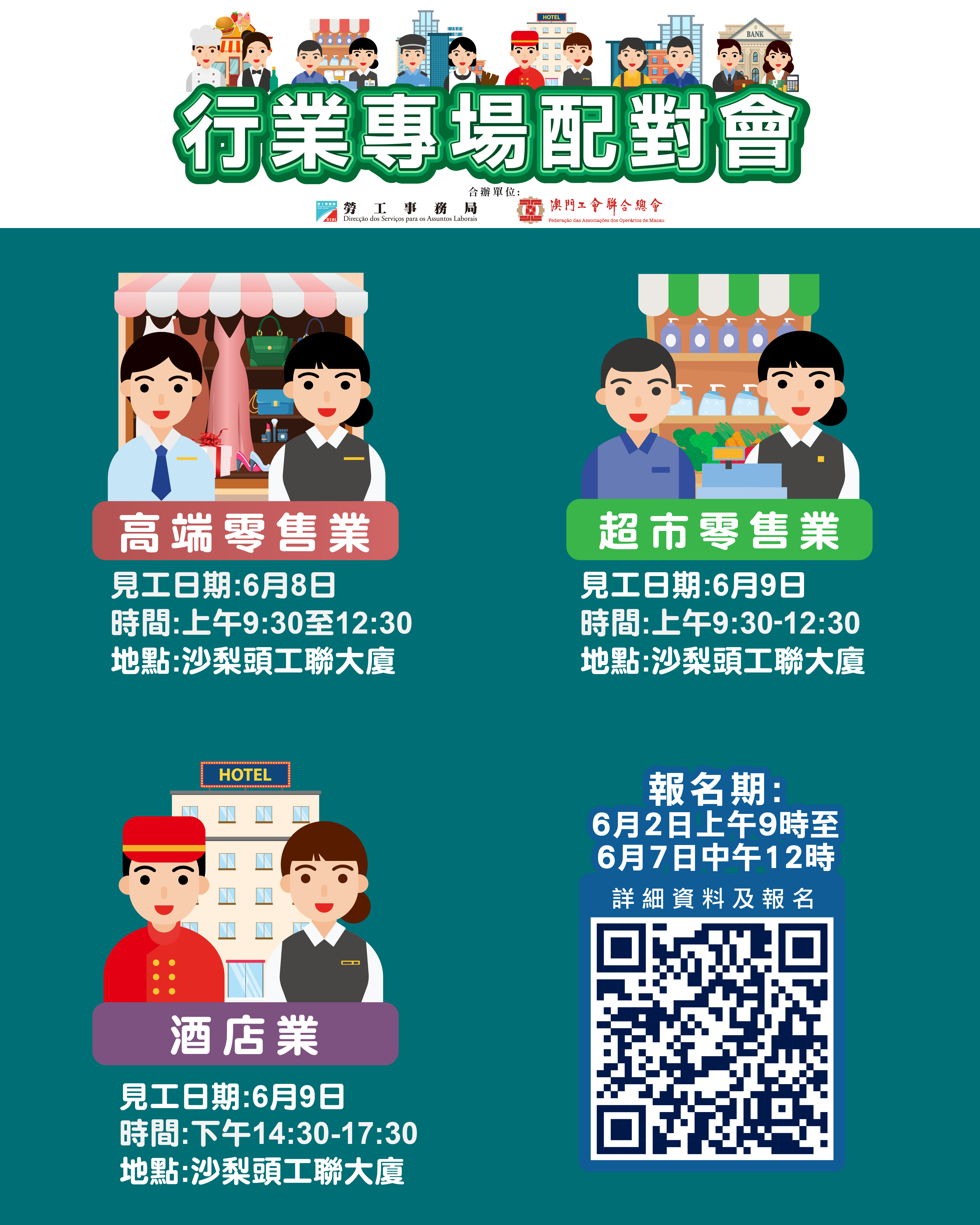 為協助有求職需求的澳門居民盡快就業,勞工事務局與澳門工會聯合總會合作,6月第二周舉辦3場行業專場配對會,合共提供337個空缺。報名日期為6月2日上午9時至6月7日中午12時。