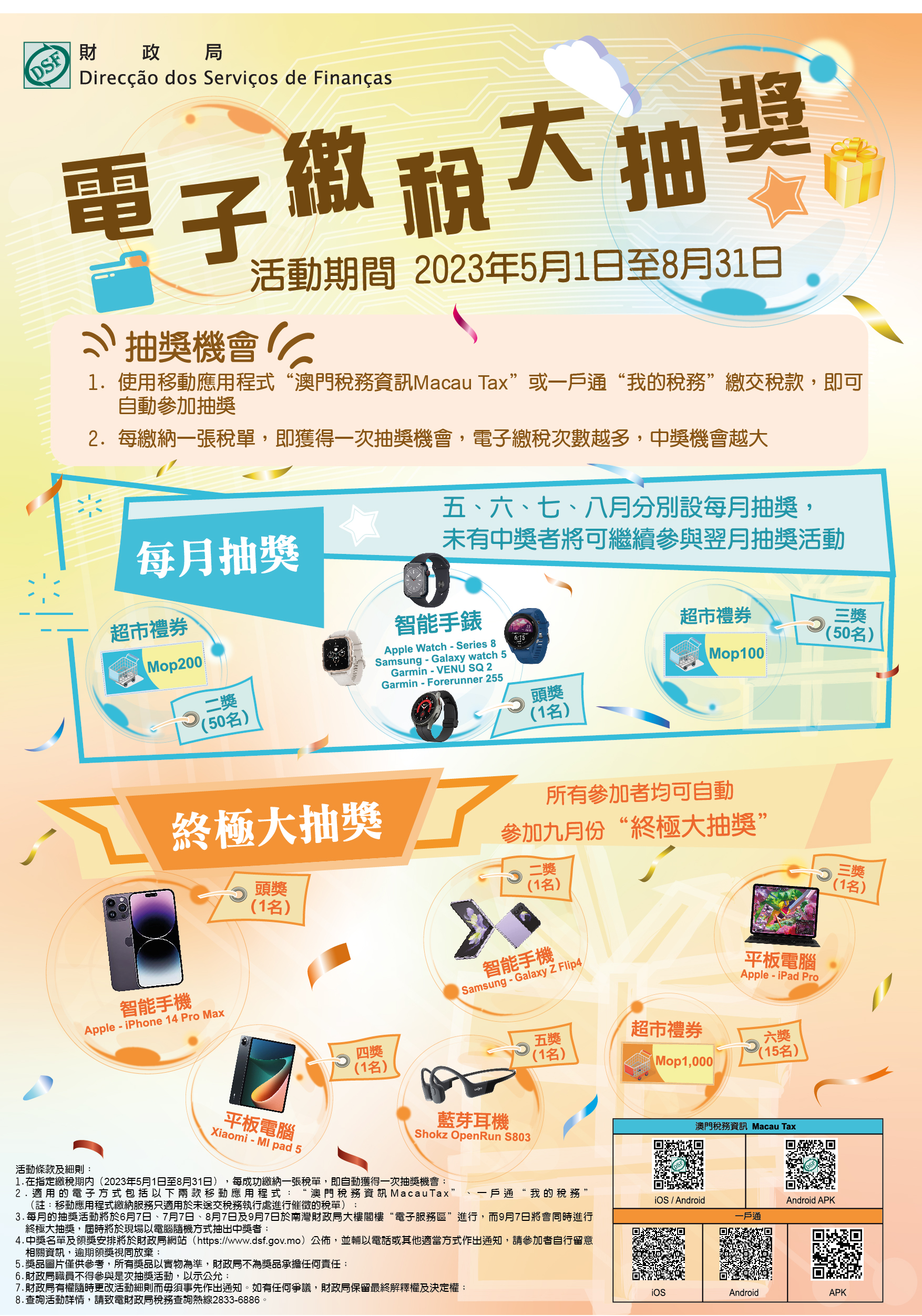 5月份之抽奬已於昨日(7日)在南灣財政局大樓閣樓“電子服務區”舉行,在黎鴻才執業會計師見證下,澳門財稅廳容志聰廳長經電腦隨機抽出1名頭獎、50名二獎、50名三獎合共101名得奬者。每月抽奬的禮品為:頭奬(1名)智能手錶、二奬(50名)超市禮券200澳門元、三奬(50名)超市禮券100澳門元。得獎名單於同日已上載至財政局網頁(https://www.dsf.gov.mo/luckyDraw2023/),以供查閱,並會以手機短訊或其他適當方式通知得獎者。請得奬者於6月30日前到南灣財政局大樓領取奬品。如有查詢,可於辦公時間致電2833 6886。