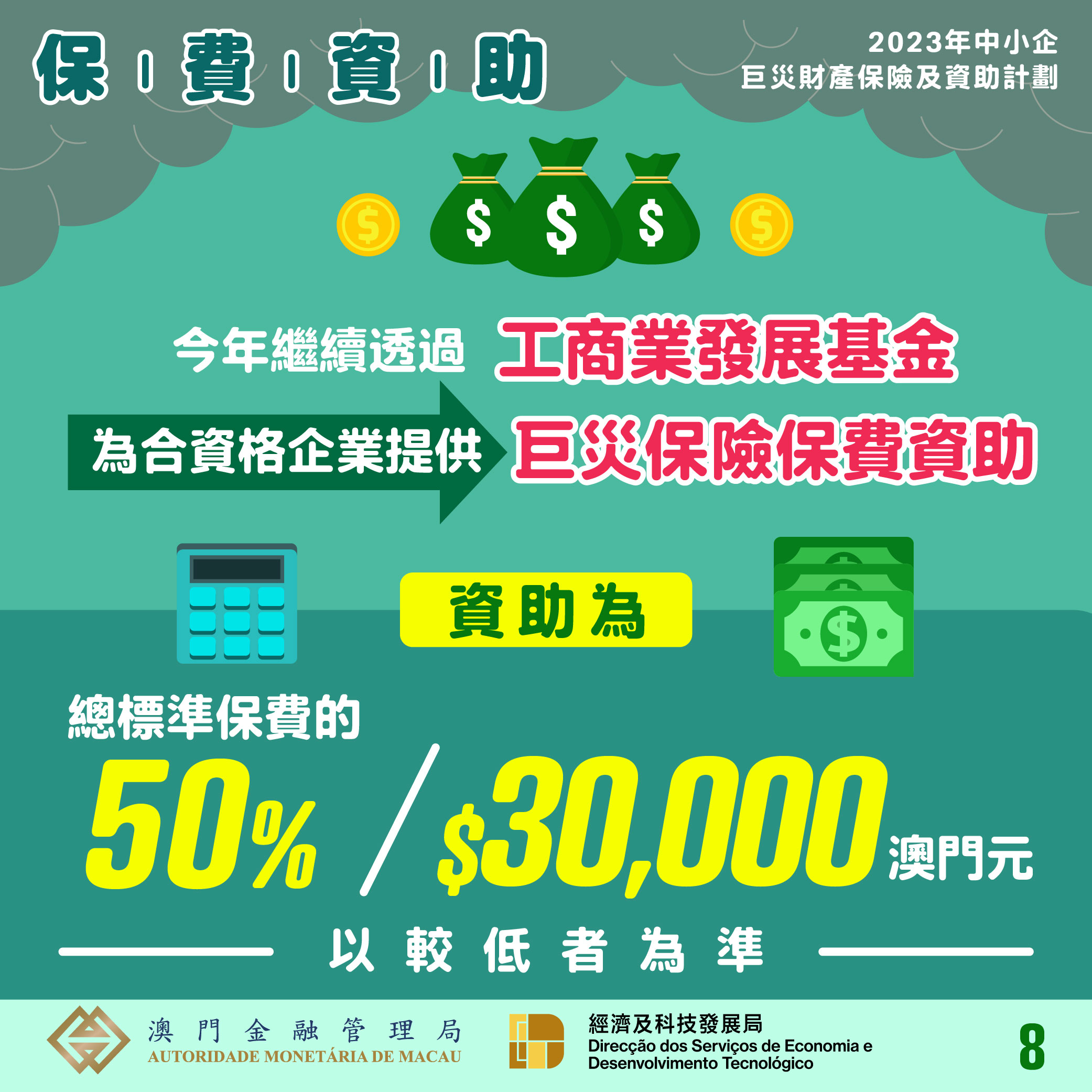 特區政府繼續透過工商業發展基金,為符合條件的中小企提供總標準保費的50%或上限3萬元(以較低者為準)的資助計劃,減輕中小企投保巨災保險的經濟負擔。連同資助計劃,商戶可節省超過五成的保費支出。