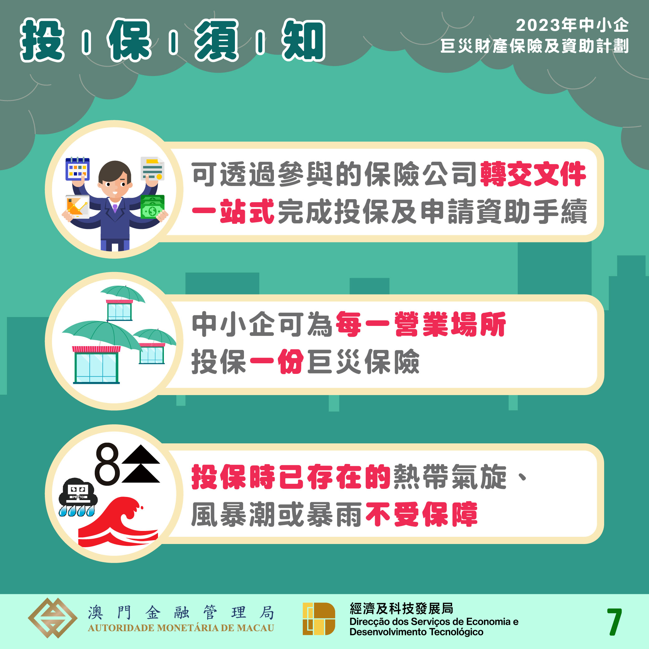 為鼓勵商戶透過商業保險轉移風險,澳門金融管理局聯動保險業界,再次優化中小企巨災財產保險(下稱“巨災保險”)的安排,支持中小企加強保險保障以應對極端氣候風險。2023年度巨災保險的優化安排包括增加保額為50萬澳門元的投保選項,保費率下調四成至15%,以及對特定曾索賠商戶提供一定的續保折扣優惠。同時,工商業發展基金將繼續推出中小企巨災財產保險資助計劃(下稱“資助計劃”),紓緩商戶經濟負擔。