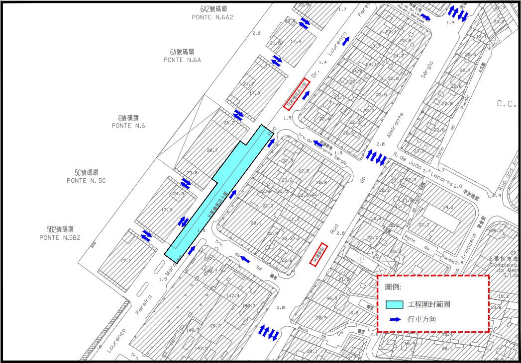 配合內港南雨水泵站及下水道第三期工程進行,在開展鄰近內港6號碼頭及5C號碼頭前的一段比厘喇馬忌士街鋪設下水道工程前,將臨時拆除比厘喇馬忌士街及河邊新街部分行人道,以擴闊行車空間及創造施工條件,減輕日後施工期間對周邊交通的影響,上述道路調整工程將於6月20日開始,施工期間的行車路線。(詳見附圖)