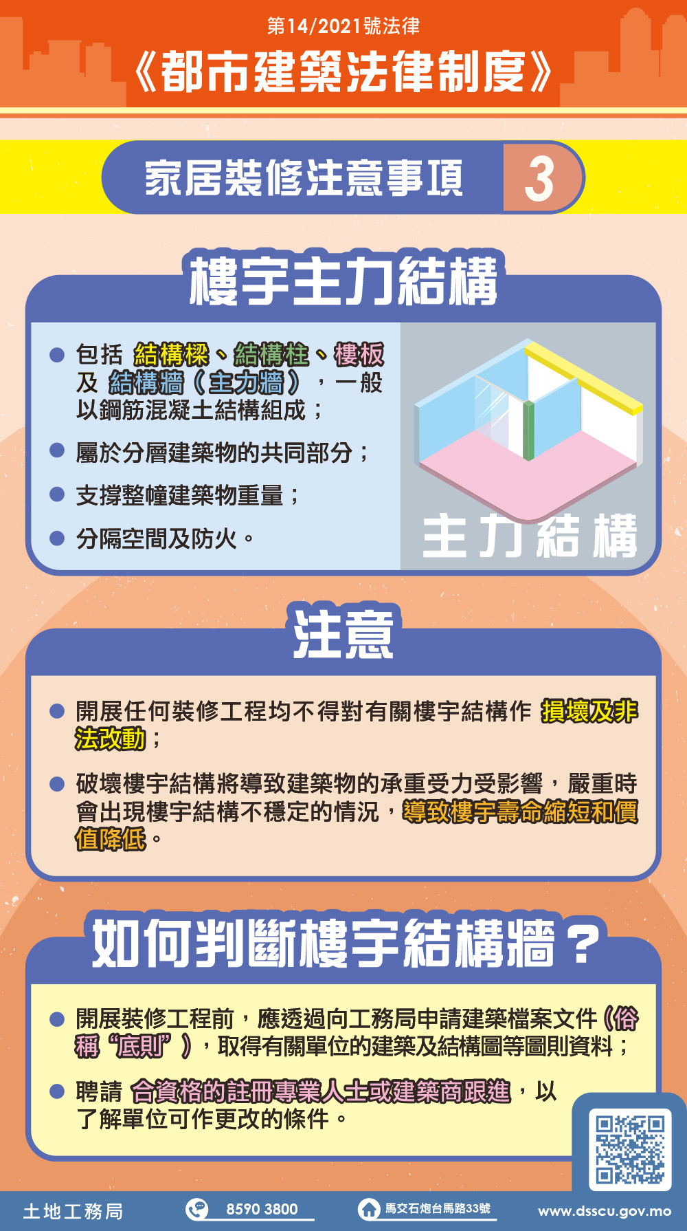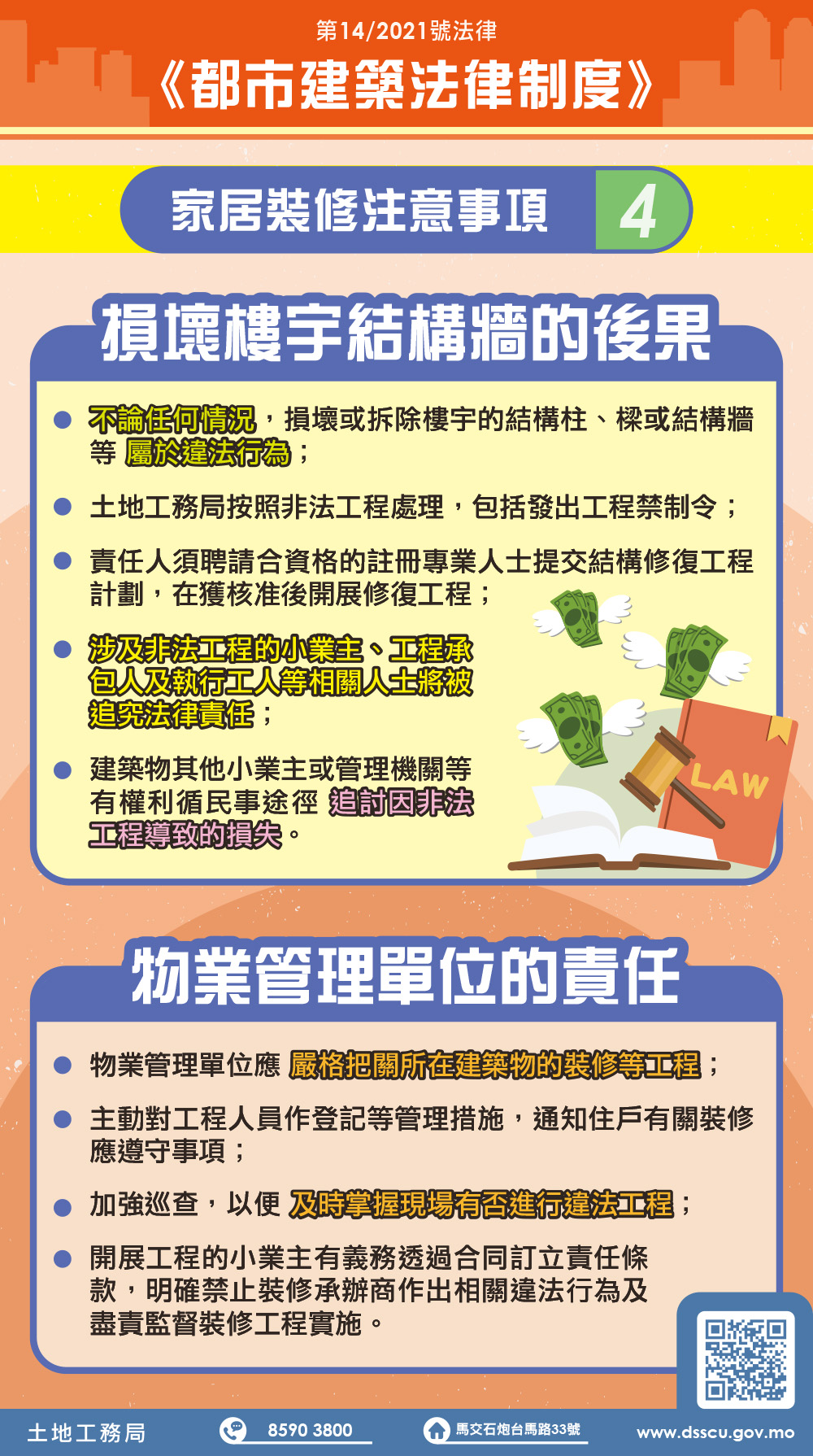 土地工務局呼籲物業管理單位應嚴格把關建築物所在的裝修等工程,主動對工程人員作登記等管理措施,通知住戶有關裝修應遵守事項,並加強巡查,及時掌握現場是否有進行非法工程。開展工程的小業主亦有義務透過合同訂立責任條款,明確禁止裝修承辦商作出相關違法行為及盡責監督裝修工程實施。市民如需更多資訊,可查閱土地工務局網站及站內 “《都市建築法律制度》資訊網”(https://www.dsscu.gov.mo/zh_HANT/sites/rjcu),或致電本局服務中心查詢,電話:8590 3800。