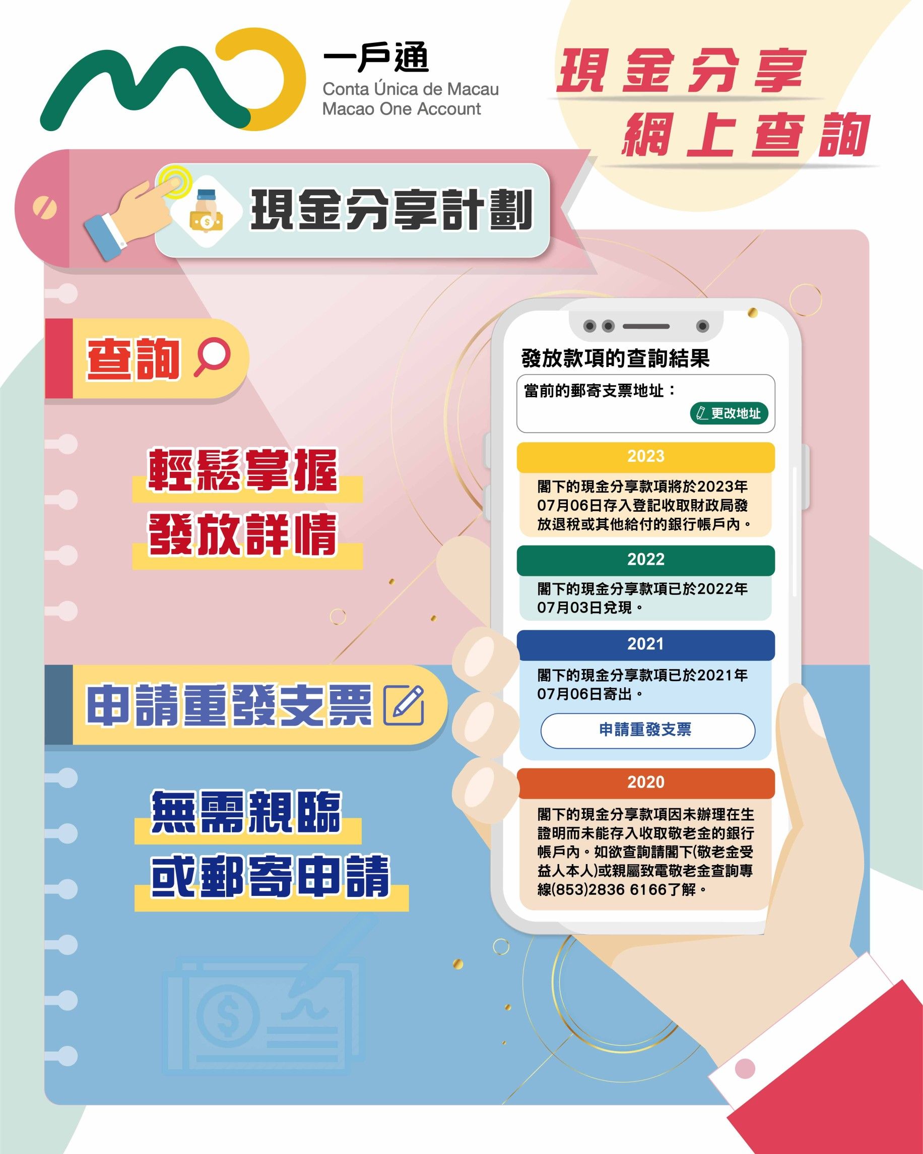 澳門居民只需登入其“一戶通”帳戶,於服務頁面選擇“現金分享計劃”,便可立即查詢現金分享款項發放狀況、未能符合法律規定發放條件的原因,以及當前的郵寄支票地址。如需更改地址或申請重發支票,亦可透過“一戶通”即時辦妥,方便居民無需親身前往部門或郵寄提交申請,隨時隨地線上辦理,省時便捷。
