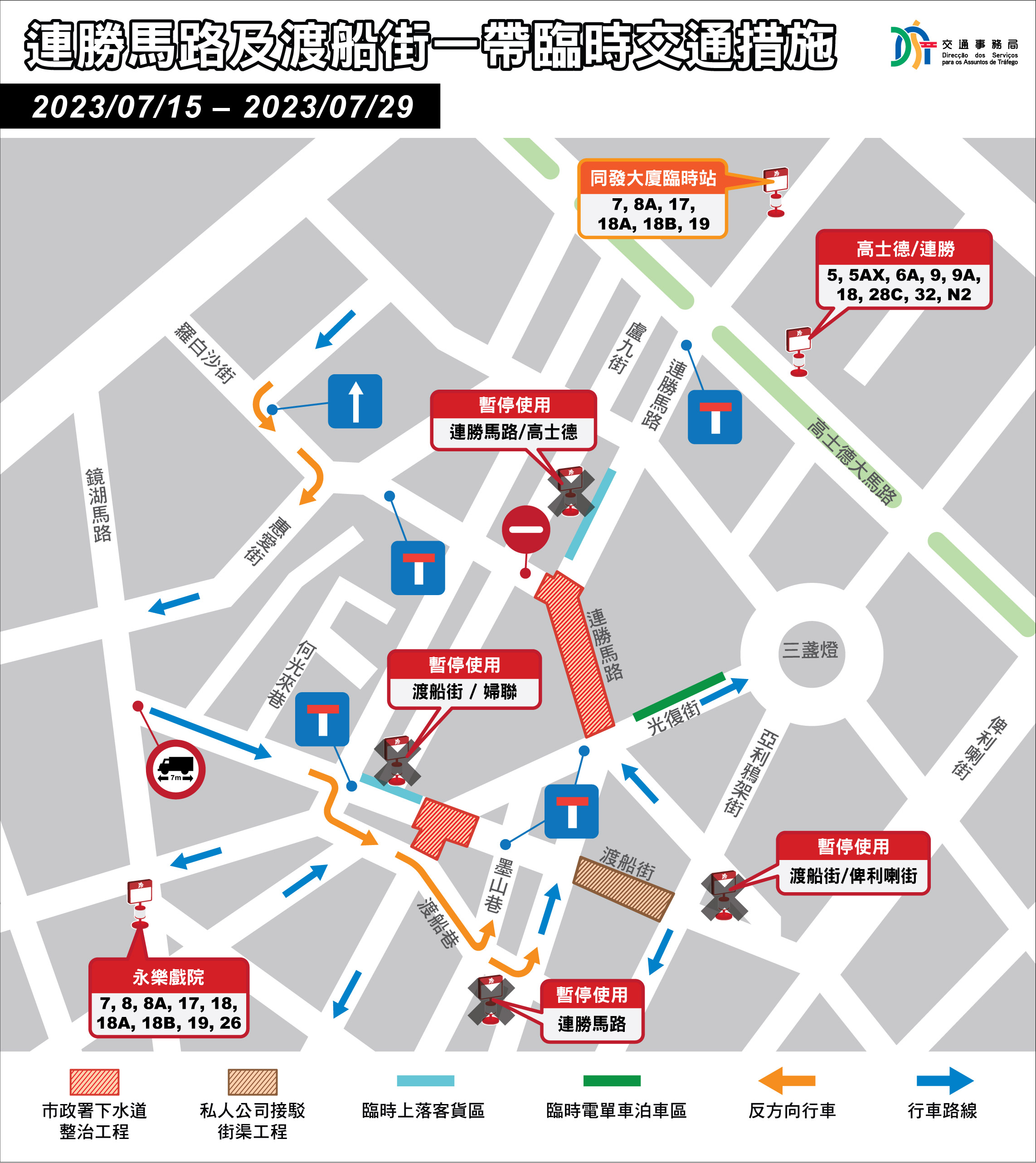 配合施工需要,於7月15日早上10時至7月29日,介乎連勝馬路與亞利鴉架街之間的一段渡船街實施封閉交通,並禁止車輛停泊該路段的咪錶泊車位。