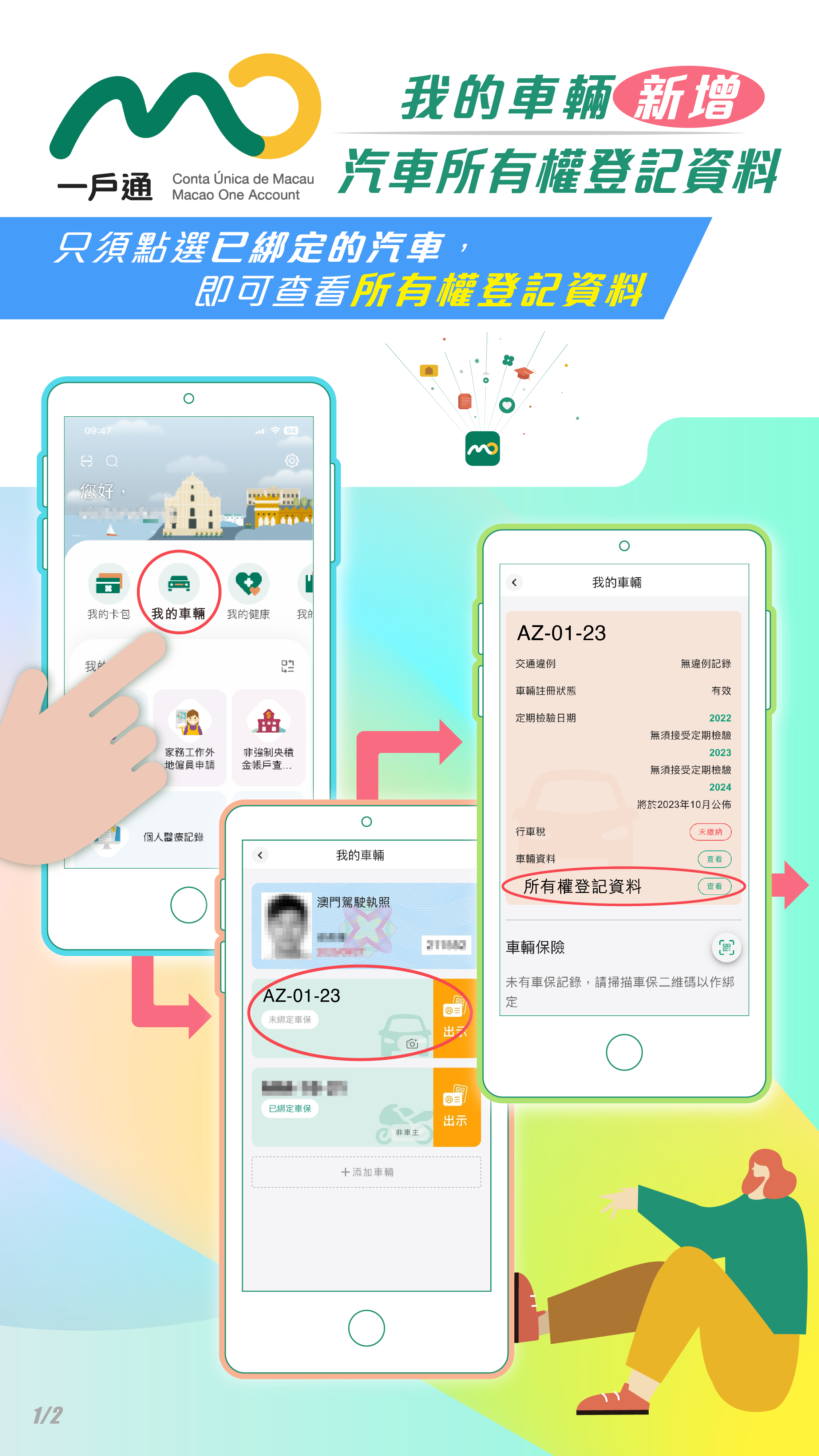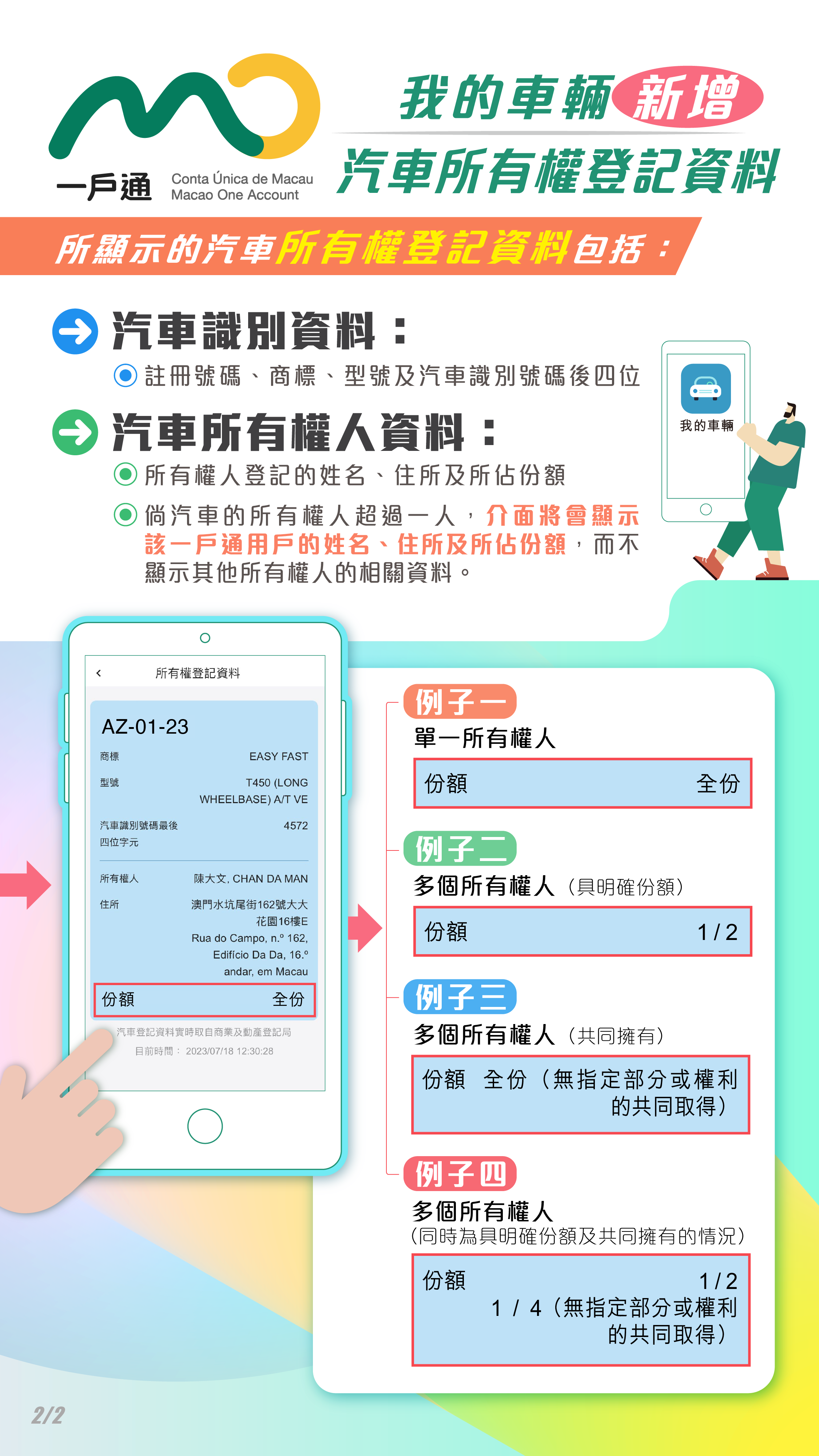 車主透過一戶通“我的車輛”功能綁定汽車後,即可查看實時取自商業及動產登記局的汽車登記資料,包括該汽車的註冊號碼、商標、型號及汽車識別號碼後四位,以及所有權人的姓名、住所和所佔份額,倘汽車的所有權人超過一人,介面只會顯示該一戶通用戶的登記資料,而不會顯示其他所有權人的資料。