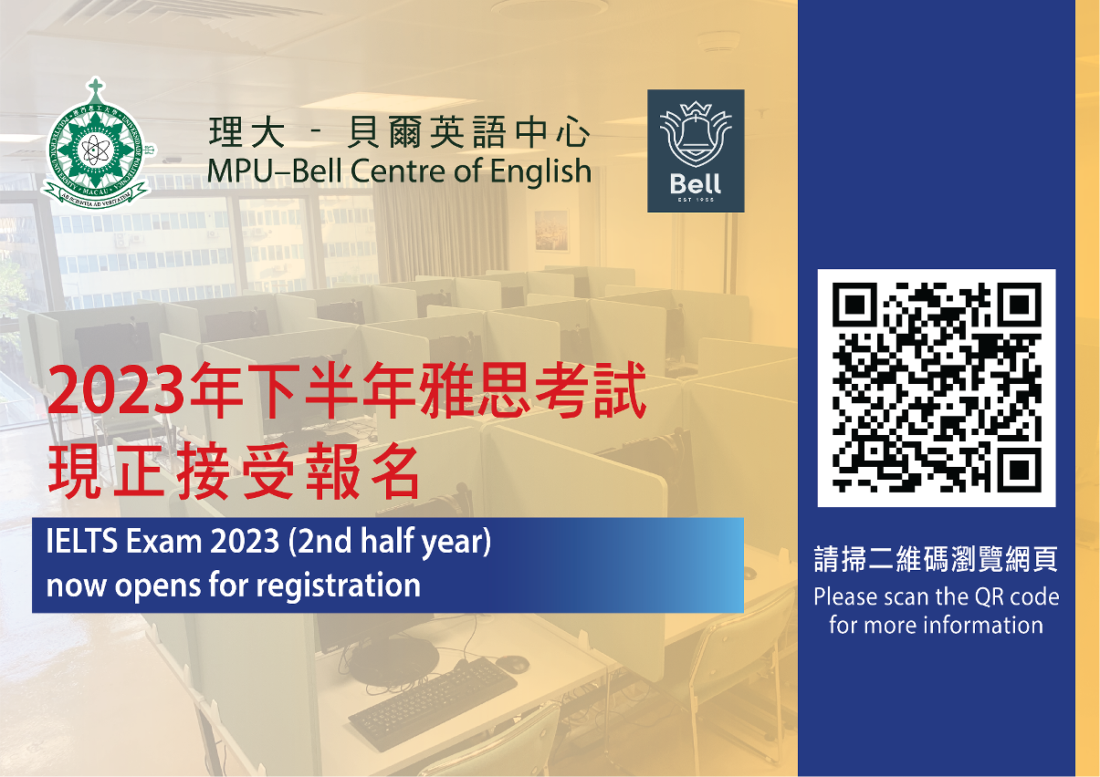 澳門理工大學-貝爾英語中心是首間於本澳開設雅思國際英語水平測試(紙筆模式)之考場,而中心為考生提供優質之考場及考試服務更榮獲英國文化協會頒發雅思考試金級夥伴獎狀,是澳門唯一獲此殊榮之考點。中心現已開放雅思下半年之考試報名,除電腦模式考試外,也設有紙筆模式考試,雅思考試於2023年7至12月及2024年1至2月期間舉行59場,有興趣報名者可登入英國文化協會(香港)網站: ieltsregistration.britishcouncil.org,選擇“Bell Centre – Macao Polytechnic University”為澳門考點進行註冊登記。澳門考生可申請 “持續進修發展計劃” 之考試資助 (澳門特區政府教育及青年發展局) 。