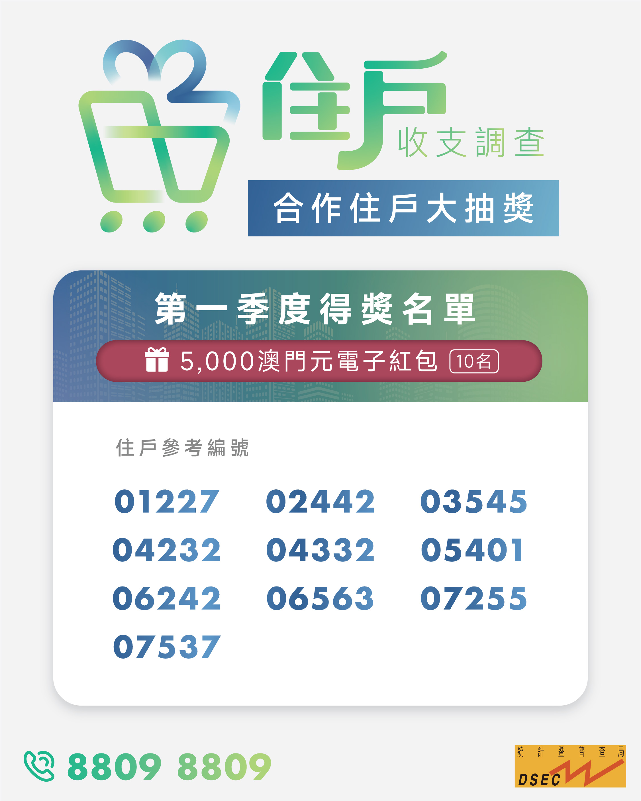首季“合作住戶大抽獎”的抽獎儀式已於7月18日舉行,共抽出10名得獎住戶,住戶參考編號如下:01227、02442、03545、04232、04332、05401、06242、06563、07255及07537。統計局將以信函方式通知得獎住戶。