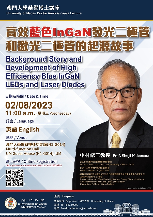 澳門大學將於8月2日(星期三)舉辦榮譽博士講座,邀請2020年澳大榮譽理學博士、2014年諾貝爾物理學獎得主中村修二教授擔任主講者,就“高效藍色InGaN發光二極管和激光二極管的起源故事”為題發表演說,歡迎有興趣人士透過澳大官網報名參加。