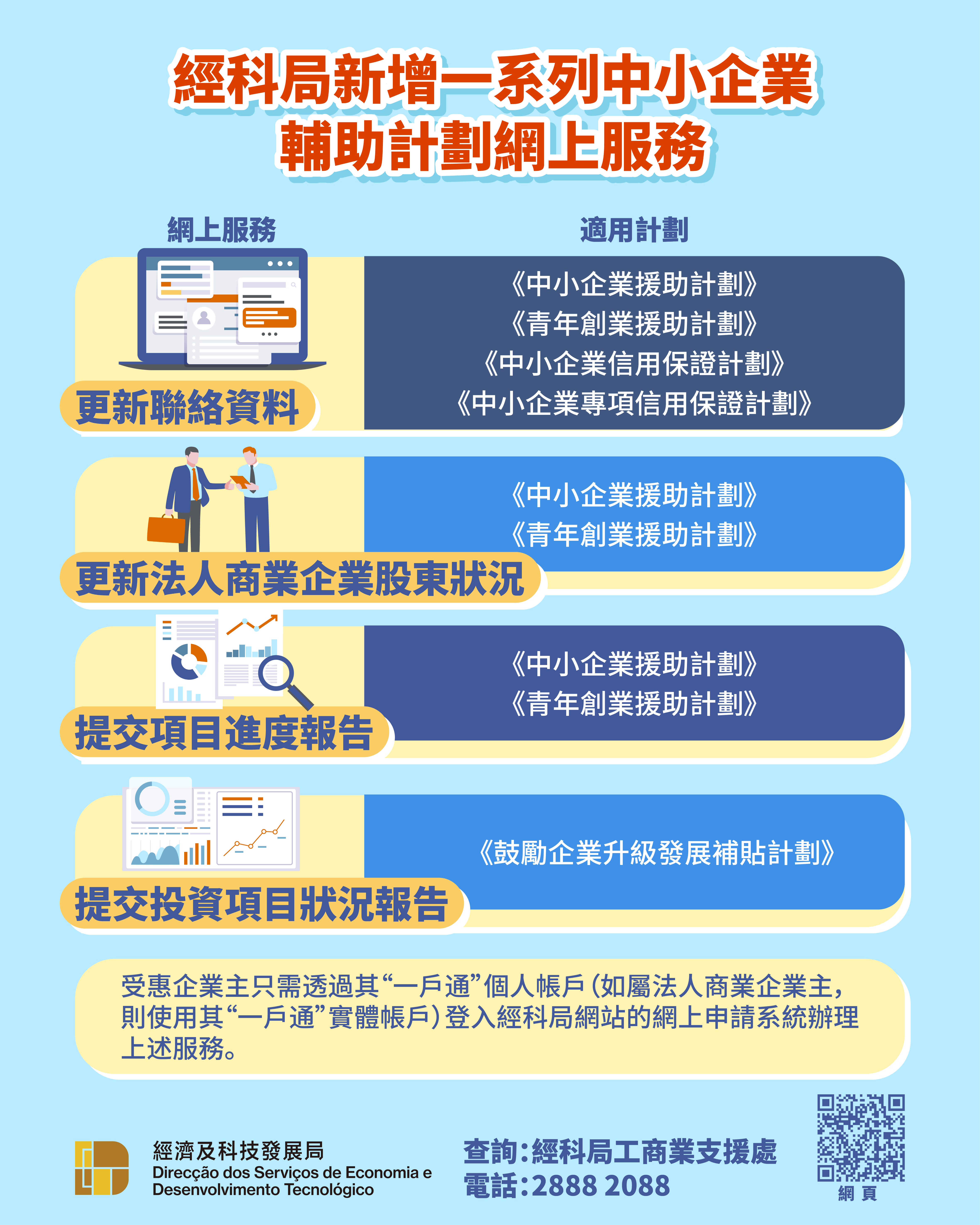 為持續優化電子政務,提供更多便民便商的服務,經濟及科技發展局自本月起就《中小企業援助計劃》、《青年創業援助計劃》、《中小企業信用保證計劃》、《中小企業專項信用保證計劃》等各項中小企業輔助計劃,新增了 “更新聯絡資料申請”、 “更新法人商業企業股東狀況申請”、“提交項目進度報告” 等多項網上服務以及就《鼓勵企業升級發展補貼計劃》新增了“提交投資項目狀況報告”的網上服務。