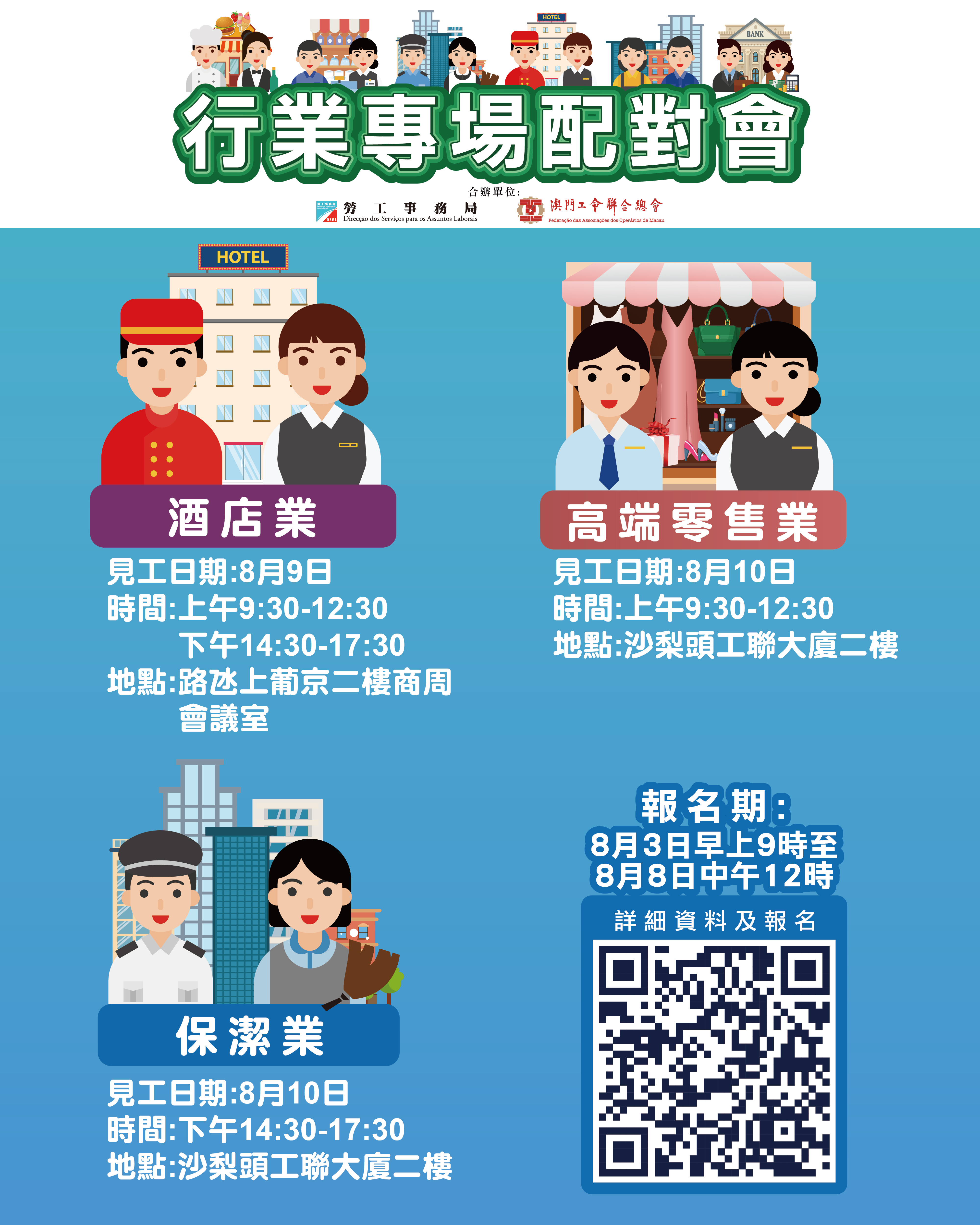 8月9日酒店業配對會在澳門上葡京二樓商周會議室舉行;8月10日上午高端零售業配對會及下午保潔業配對會均在澳門工會聯合總會二樓(沙梨頭海邊街2-6號工聯大廈)舉行,報名日期為8月3日上午9時至8月8日中午12時。