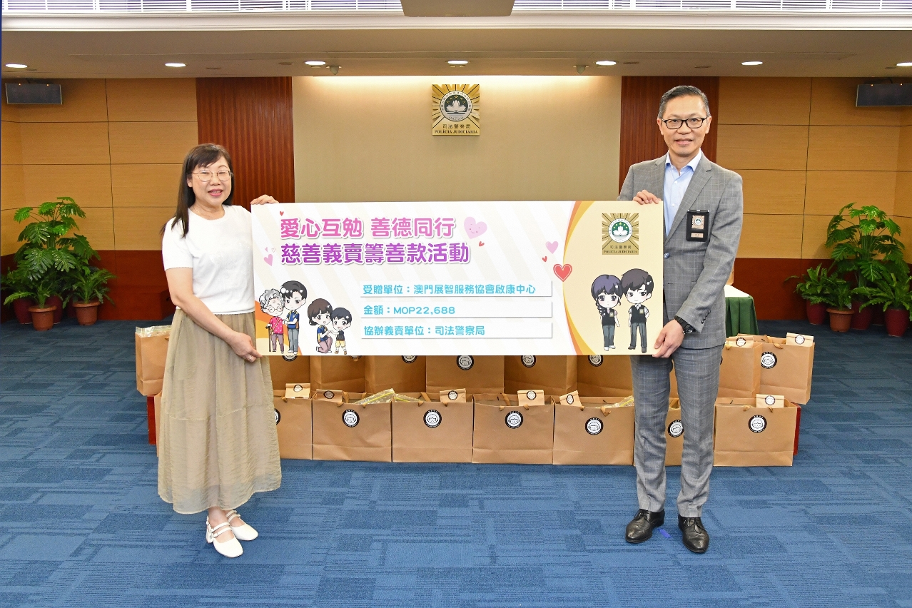 為加強警隊文化建設,提升警隊人員的社會責任感和關愛精神,推動警民合力構建關愛共融社會,向大眾傳遞積極、正面訊息,司法警察局與澳門展智服務協會早前合辦慈善義賣活動,最終籌得逾22,000澳門元善款,並於2023年8月3日舉行善款支票移交儀式,將有關善款贈予上述康復服務團體。近兩年,司警局派員走訪本澳各康復服務團體,聽取各團體代表對治安方面的訴求,以及探討深化與各康復服務團體的合作。為支持康復服務團體協助復康人士融入社會的措施,司警局今年6月起於局內員工餐廳闢設義賣點,義賣由復康人士製作的精美手工禮品,計劃持續為不同康復服務團體義賣籌款,以激發工作人員關心社會及弱勢群體需要,同時為康復服務團體籌募善款。今年6月至7月期間,司警局協助澳門展智服務協會在局內設點義賣,不少司警局人員得悉上述活動後,紛紛親臨現場支持踴躍購買,最終共賣出520份手工禮品,籌得逾22,000澳門元善款。