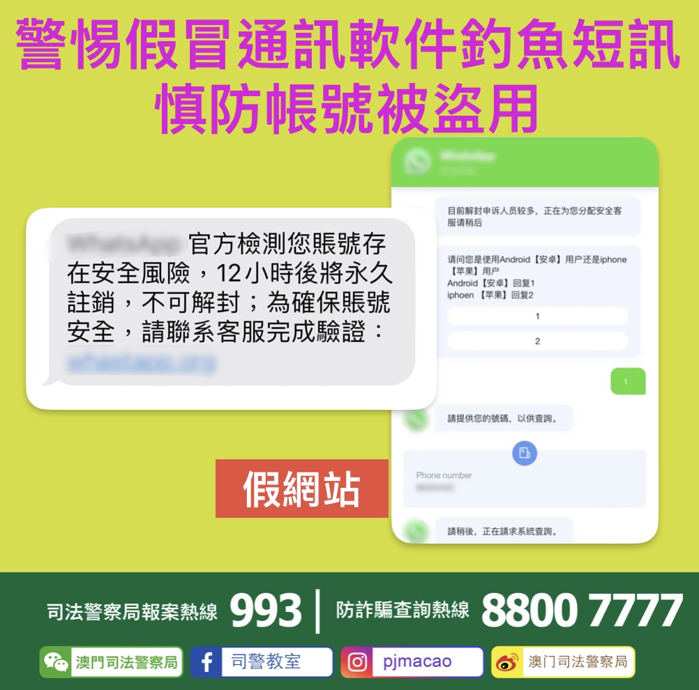 近日,司法警察局發現有不法分子假冒官方通訊軟件公司向市民發送附有不明連結之短訊,訛稱其手機通訊軟件帳戶“存在安全風險及將被註銷”,誘騙市民點擊短訊內的連結及跳轉至假冒客服聊天機械人,隨後事主輸入手機號碼及驗證碼等資料,騙徒企圖藉此盜取相關通訊軟件的帳號使用權。