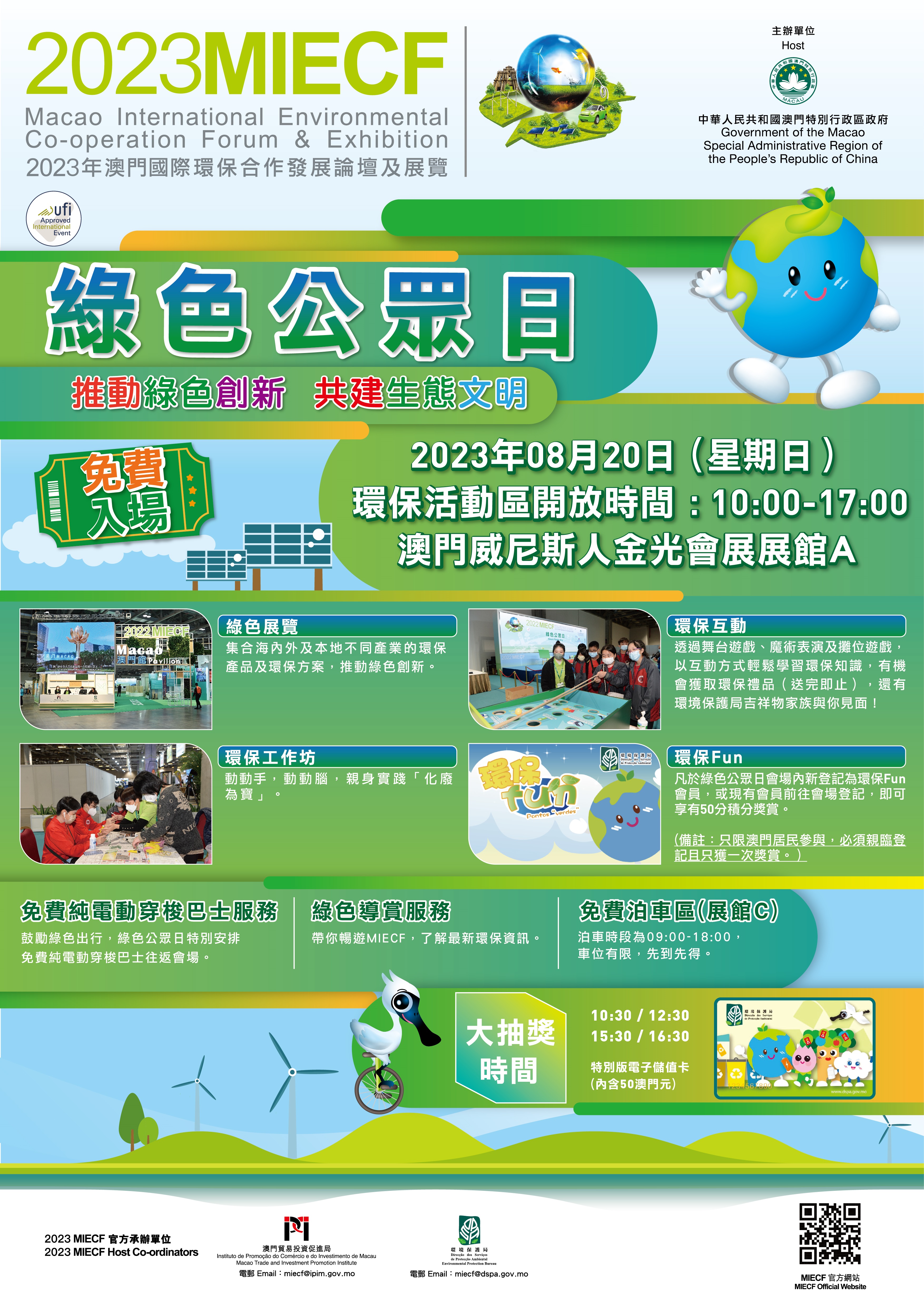 大會於“綠色公眾日”當天提供4條免費純電動穿梭巴士路線往返澳門中區、北區及氹仔與MIECF會場,鼓勵市民綠色出行。環保活動區開放時間為上午10時至下午5時。