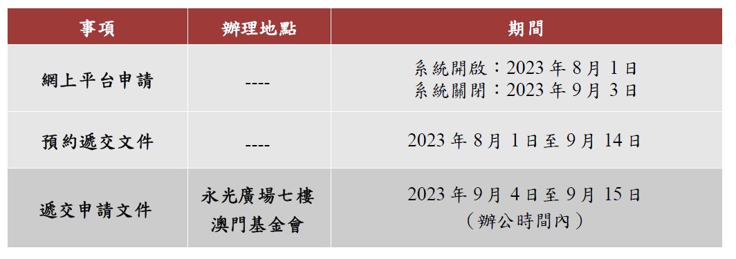 澳門基金會2024年度上述三項資助計劃的章程及圖文包已上載澳門基金會網頁(https://www.fmac.org.mo/sponsorship/),有意申請者須憑有效帳戶於9月3日系統關閉前在澳基會網上資助申請平台提交申請,並預約於9月4日至15日期間現場遞交申請文件正本,包括已簽署及蓋章的申請表等申請文件。澳門基金會呼籲有意申請者盡早辦理或更新網上平台帳戶以及提交網上申請,平台申請、現場遞交文件任一環節逾期提交的申請均不受理。