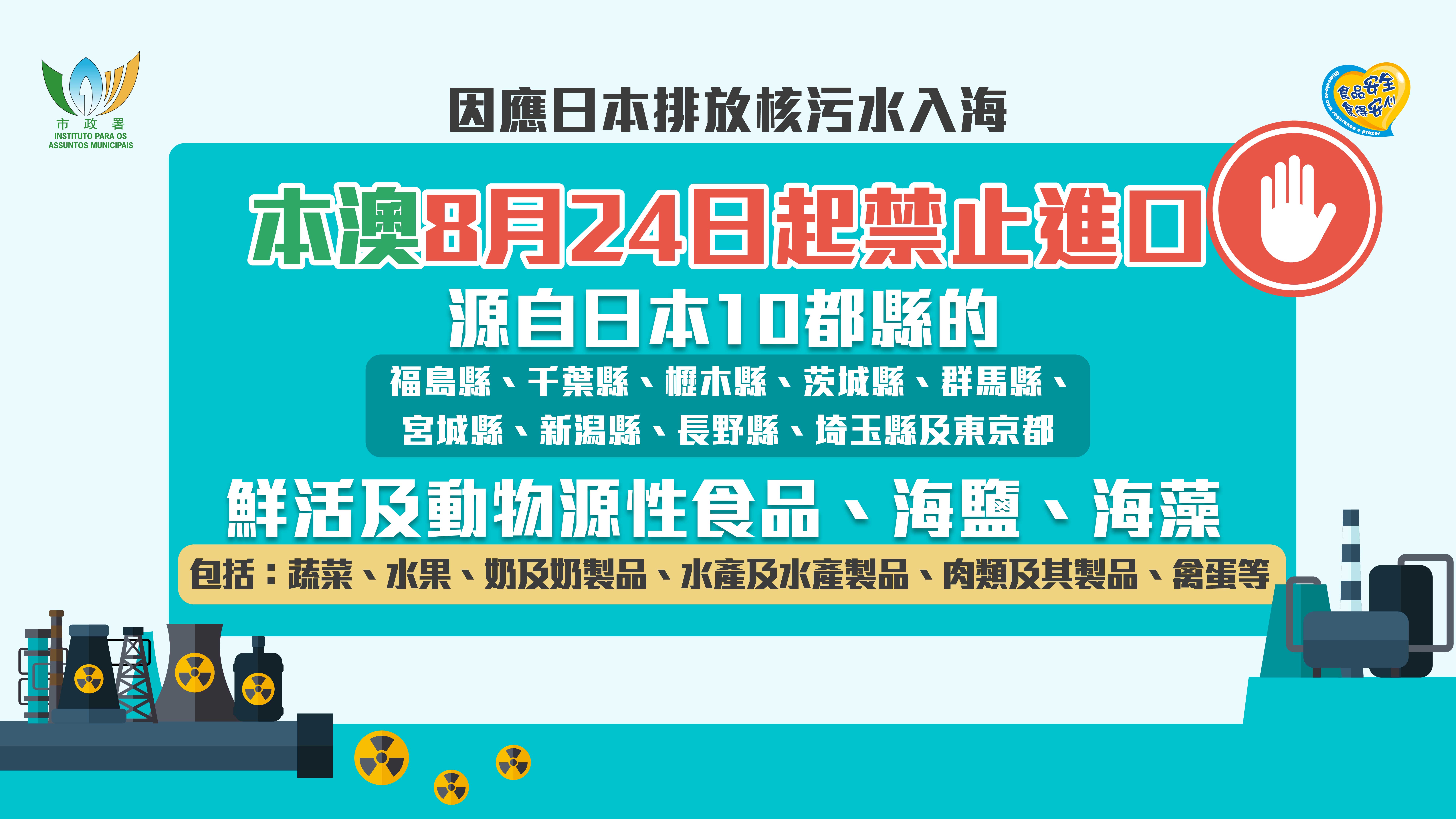 日本宣佈將於近日排放福島核污染水入海,特區政府對此表示強烈不滿。為保障本澳的食品安全和居民健康,特區政府將採取必要的措施,從2023年8月24日起禁止進口源自福島縣、千葉縣、櫪木縣、茨城縣、群馬縣、宮城縣、新潟縣、長野縣、埼玉縣及東京都共十個都縣區的鮮活食品、動物源性食品、海鹽及海藻,包括蔬菜、水果、奶及奶制品、水產及水產製品、肉類及其製品、禽蛋等。