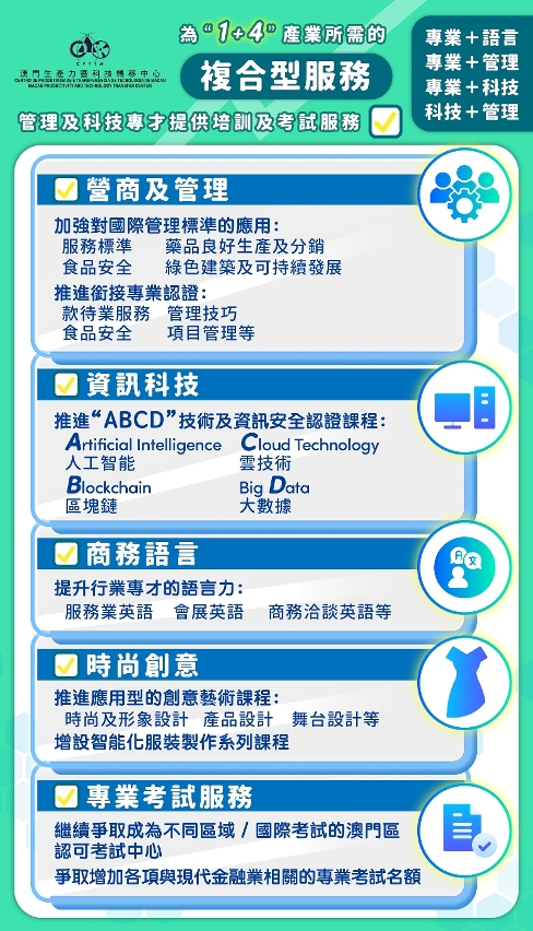 澳門生產力暨科技轉移中心配合特區政府1+4 適度多元發展策略,致力為四大產業發展培養所需的複合型服務、管理及科技專才,並透過配套的專業考證服務,鞏固及提升本澳企業及市民的生產力,迎接未來的機遇。