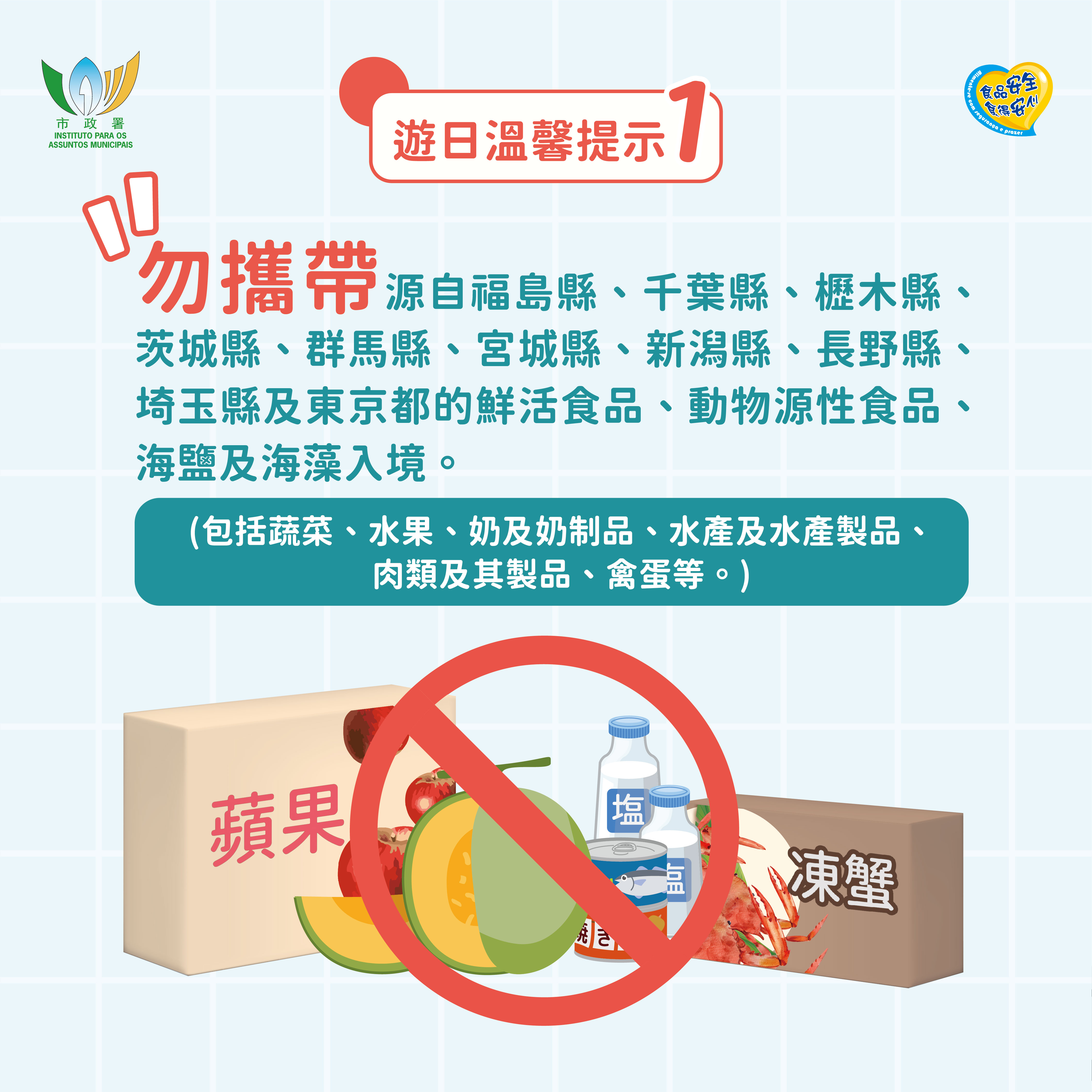 巿政署及澳門海關同時呼籲,前往日本旅遊的居民,注意切勿攜帶上述禁止進口的食品回澳。如有查詢或想了解更多相關資訊,可致電澳門海關熱線89894317或食安專線28338181。