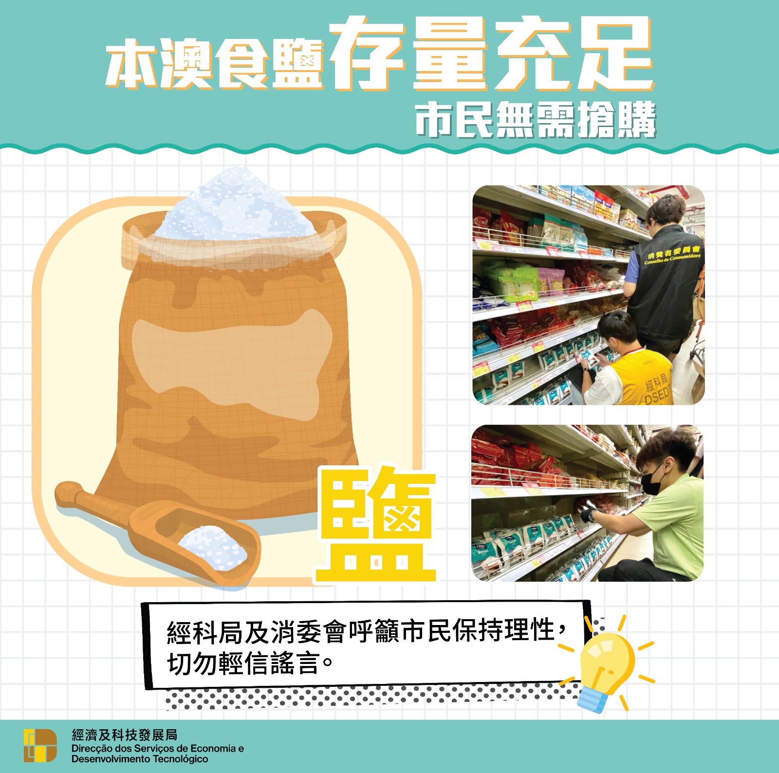 消費者委員會與經濟及科技發展局表示,本澳食鹽存量與貨源均充足,呼籲市民無需過量採購,將持續密切關注市面情況,加強巡查,嚴防抬價,並會與供應及零售商保持密切溝通,要求確保本澳食鹽供應維持穩定。