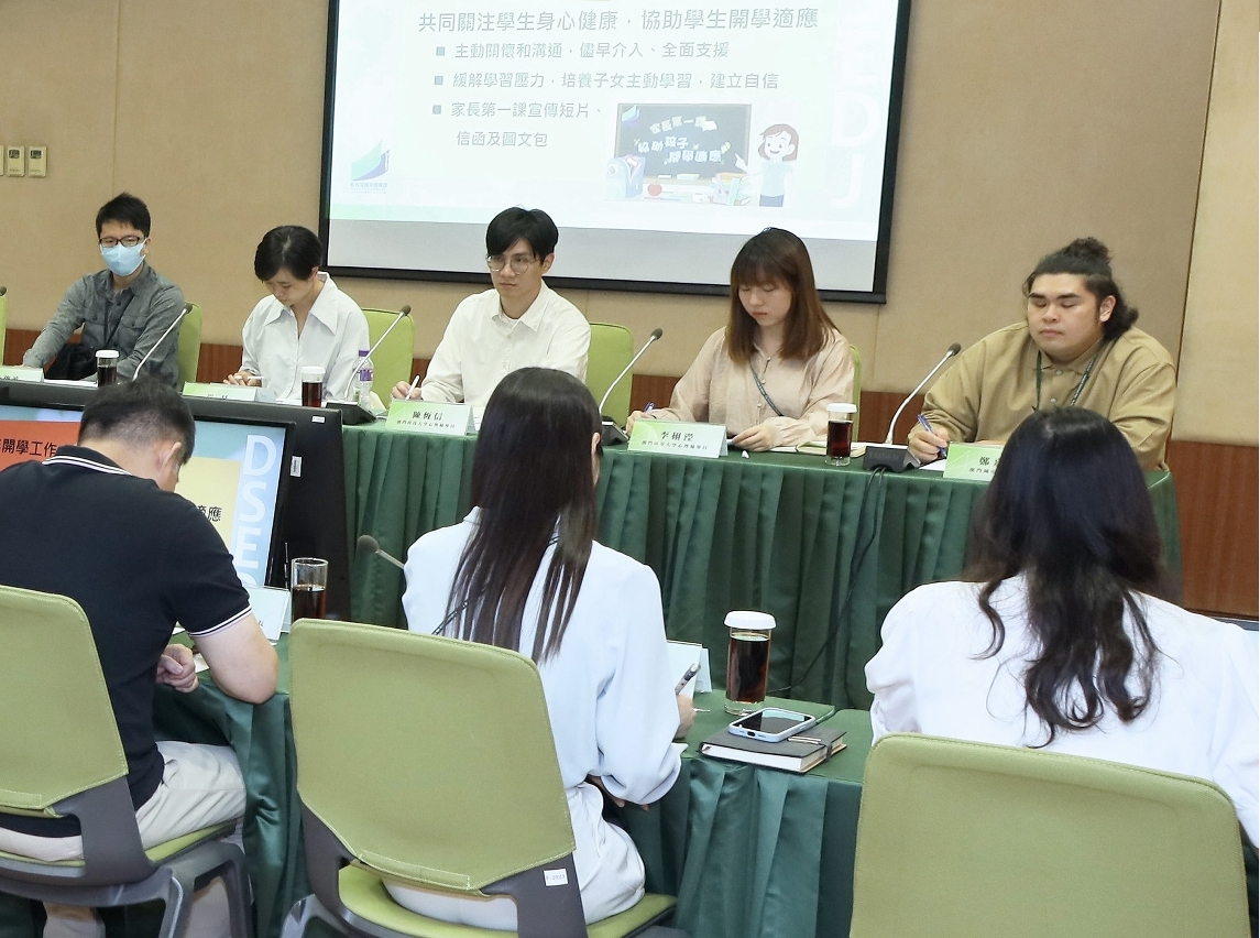 教青局於暑假期間持續協調學生輔導團隊跟進學生的情況,並在開學前與學生輔導機構進行會議,介紹開學注意事項及協調輔導員共同關顧支援學生的身心健康及開學適應。黃嘉祺副局長介紹教青局於8月份為新學年開學開展一系列預備工作,並透過“開學第一課”及“家長第一課”提醒學校及家長共同協助學生開學適應及為學生營造健康安全的校園等。新學年亦將推出入校親子體驗教育活動,製作精神健康補充素材、微電影、繪本等教學資源,支援家長及學校進行生命教育,亦會繼續到全澳學校進行培訓和支援,提升教學人員對學生個案的識別及應對技巧,持續地進行身心健康的宣導工作。