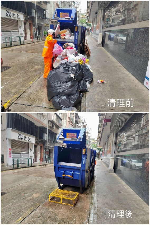 同時,市政署協調澳門清潔專營有限公司調動所有人力,日、夜間合共出動增加垃圾車輛至32架(平日21架),並延長工作時間,以加快清運各區垃圾,盡快回復市面衛生情況。市政署呼籲市民不要將垃圾隨便棄置在街道上,應先棄置易腐壞的垃圾,須包好放入公共垃圾收集設施,而高層大廈的管理實體亦應配合將垃圾桶有序推放到公共街道待收,並須保持周邊環境衛生,讓澳門清潔專營有限公司能集中清運,加快災後恢復工作。。
