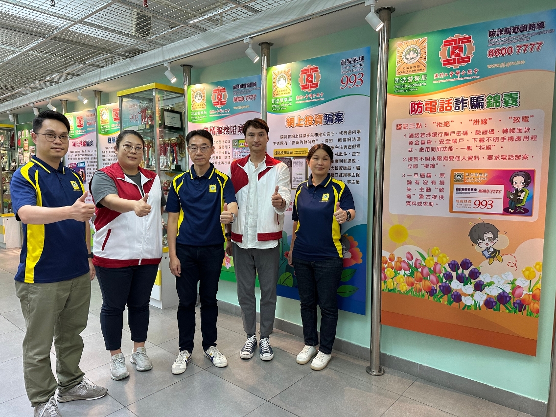 為提高居民預防電話及網絡詐騙的意識,司法警察局與“司警局大廈防罪之友”的社團成員合作,於社團轄下的辦事處及社區服務中心設立防騙宣傳教育展板,向居民宣講防騙資訊,提醒他們加強警惕,勿讓騙徒有機可乘。