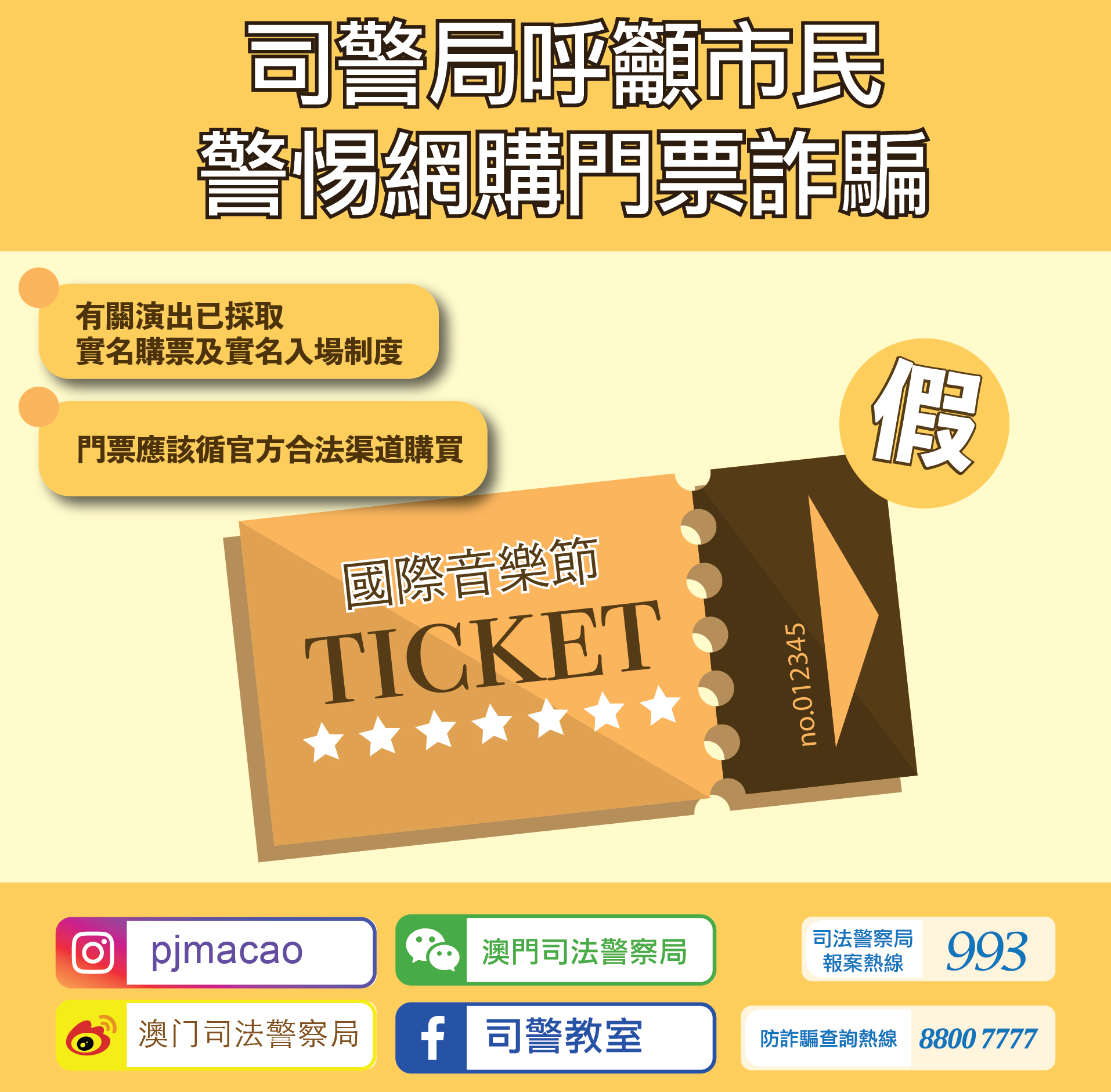 司警局提醒市民,有關演出已採取實名購票及實名入場制度,門票應該循官方合法渠道購買,切忌向身份及來歷不明的人士以“先付款、後寄貨”方式購買門票或其他商品,提防各類型網購陷阱,以免上當受騙而招致財產損失。倘若懷疑遇到詐騙,應立即致電司警局防詐騙查詢熱線8800 7777或報案熱線993求助。