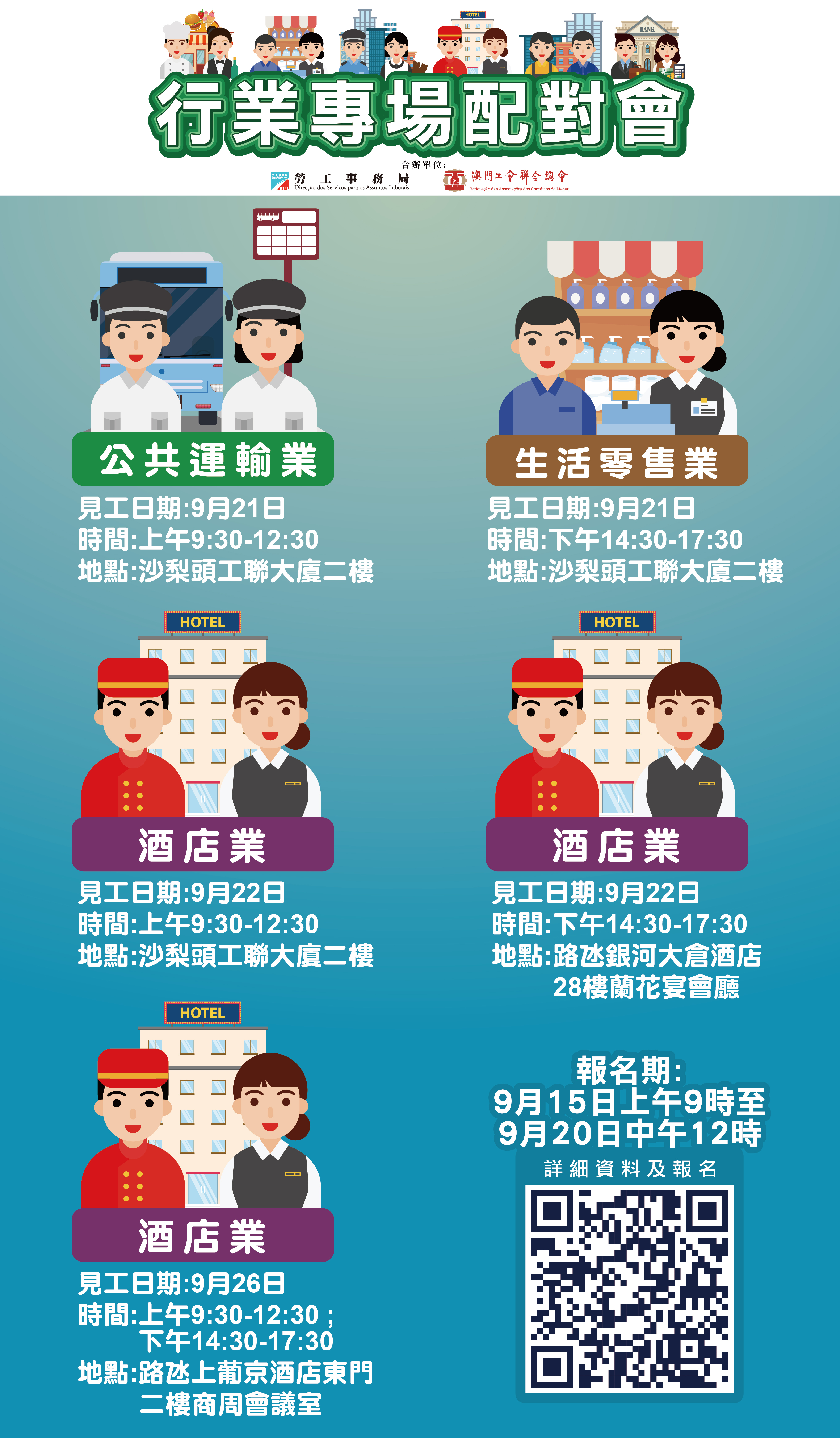 9月22日上午及下午分別舉辦2場酒店業配對會,上午場配對會提供113個職位空缺,涉及會計部經理、資訊科技部經理、人力資源部主任、物業部主任、保安主任、平面設計師、審計員、文員、前台服務員、水吧服務員及廚師等。以上配對會在澳門工會聯合總會二樓(沙梨頭海邊街2-6號工聯大廈)舉行。下午場配對會提供103個職位空缺,涉及餐廳助理經理(娛樂場)、餐飲部長(娛樂場)、餐飲服務大使(娛樂場)、調酒員(娛樂場)、廚師及管事服務員。下午場配對會在澳門大倉酒店28樓蘭花宴會廳舉行。