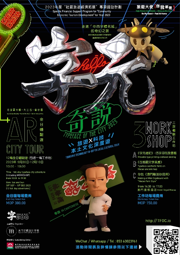 本土文化深度遊《字元奇說》將社區旅遊結合科技。活動以文字為載體,設計獨特的導賞路線及工作坊體驗,透過沿途講述特色老店鋪、手寫招牌、西式建築物及洋文石碑等,尋找和認識澳門字體足跡,並結合AR擴增實境技術,讓參與者體驗及了解澳門昔日面貌、背後的城市故事及歷史文化。活動日期分別為:9月30日;10月1、14、15、28、29日;11月11、12、25、26日及12月9、10日共12場,全日體驗遊時間為早上10時至晚上7時,行程分上下午進行。