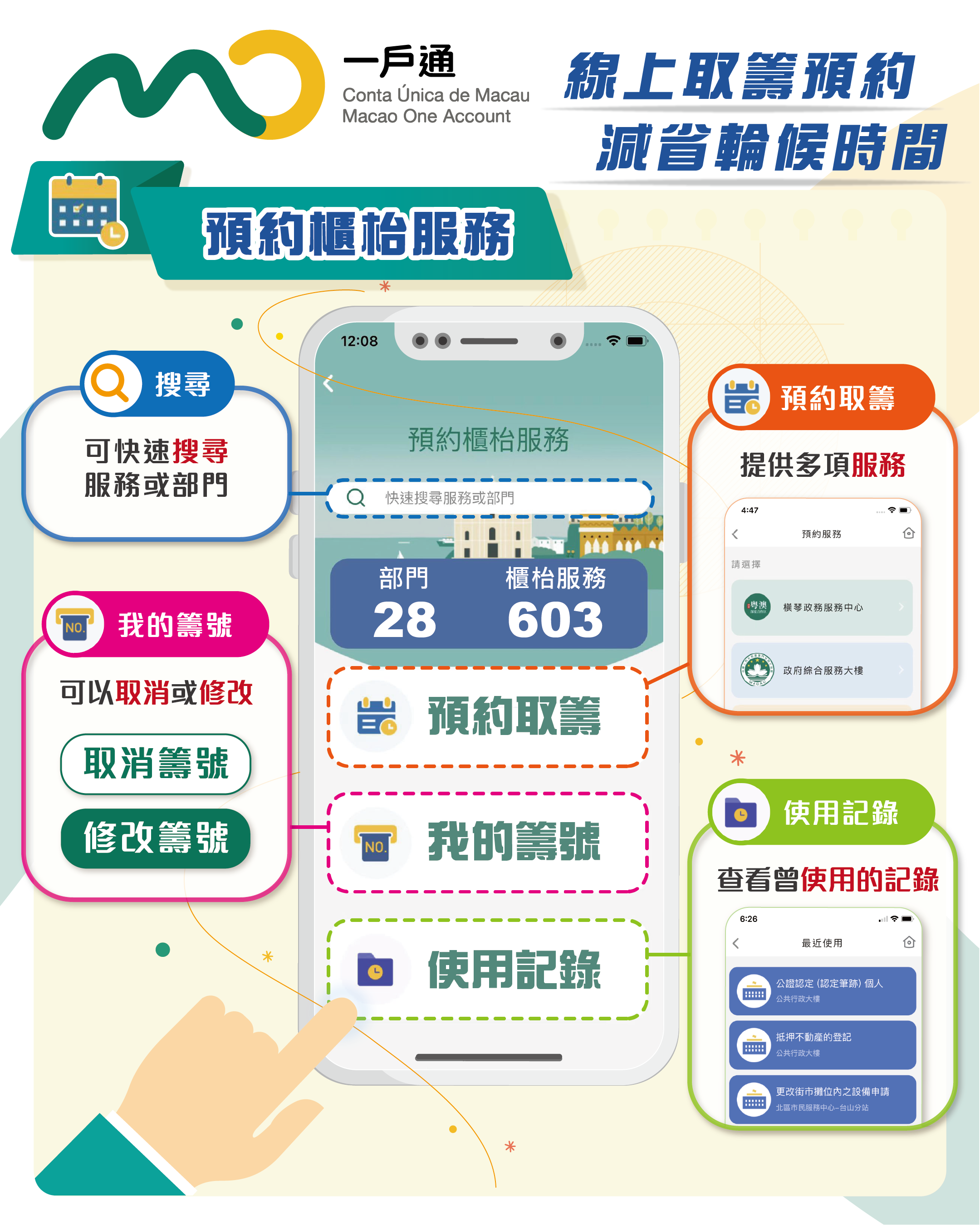 為優化服務流程,提高服務素質,“一戶通”持續整合本澳各部門的電子服務。其中,預約櫃枱服務由過往提供9個部門的預約,大幅擴展至現時28個部門,新增服務逾600項,涉及稅務、就業、社福、身份、市政、政務、公證、工務、交通、出入境等範疇。