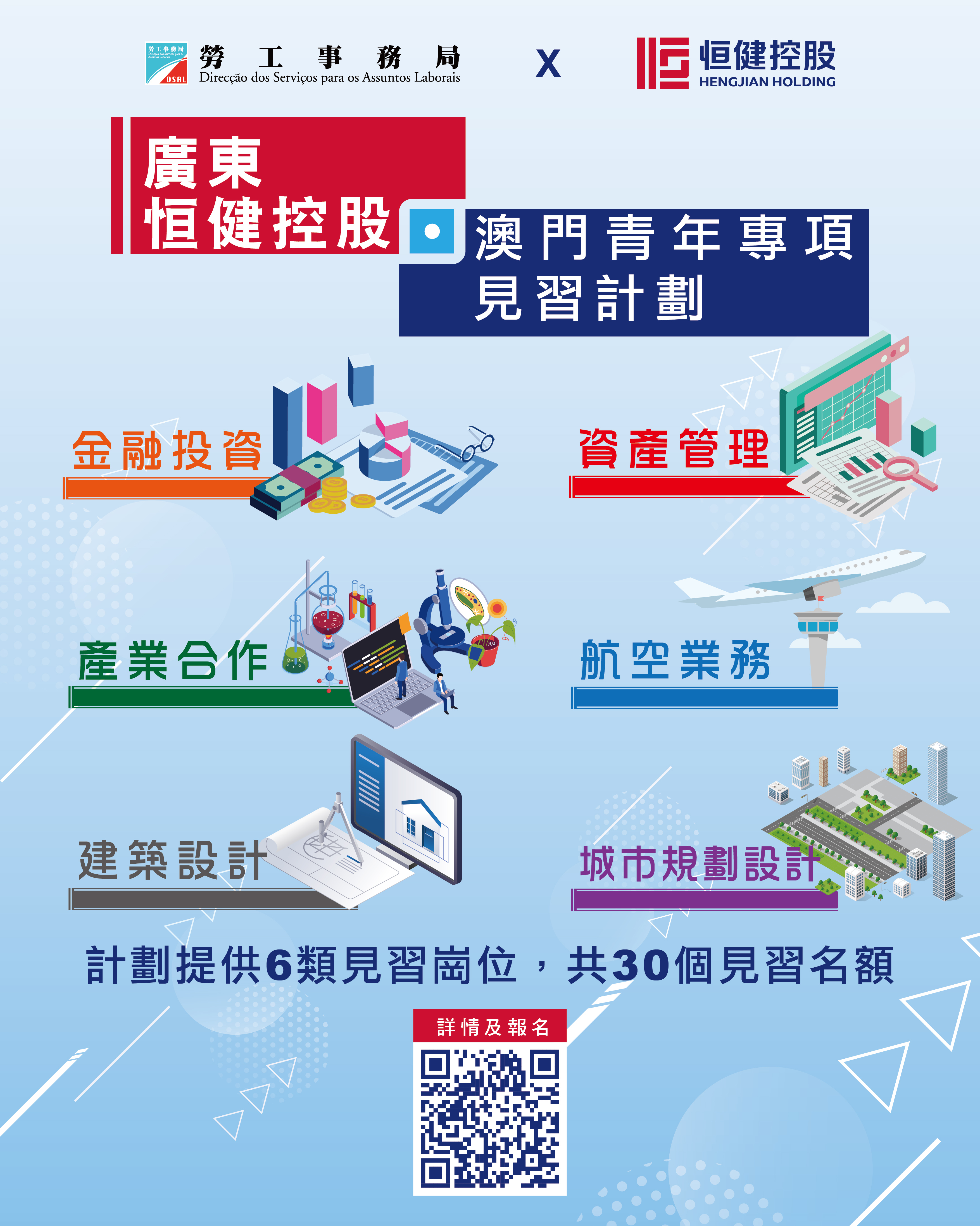 為配合特區政府“1+4”經濟適度多元發展策略,培育及儲備金融相關產業人才,勞工局和廣東恆健投資控股有限公司(下稱“恆健控股”)合作推出“廣東恆健控股‧澳門青年專項見習計劃”。該計劃由恆健控股(廣東省級國有資本運營公司和省委、省政府重大戰略投資平台)提供30個見習崗位,9月21日起至10月6日接受網上申請。