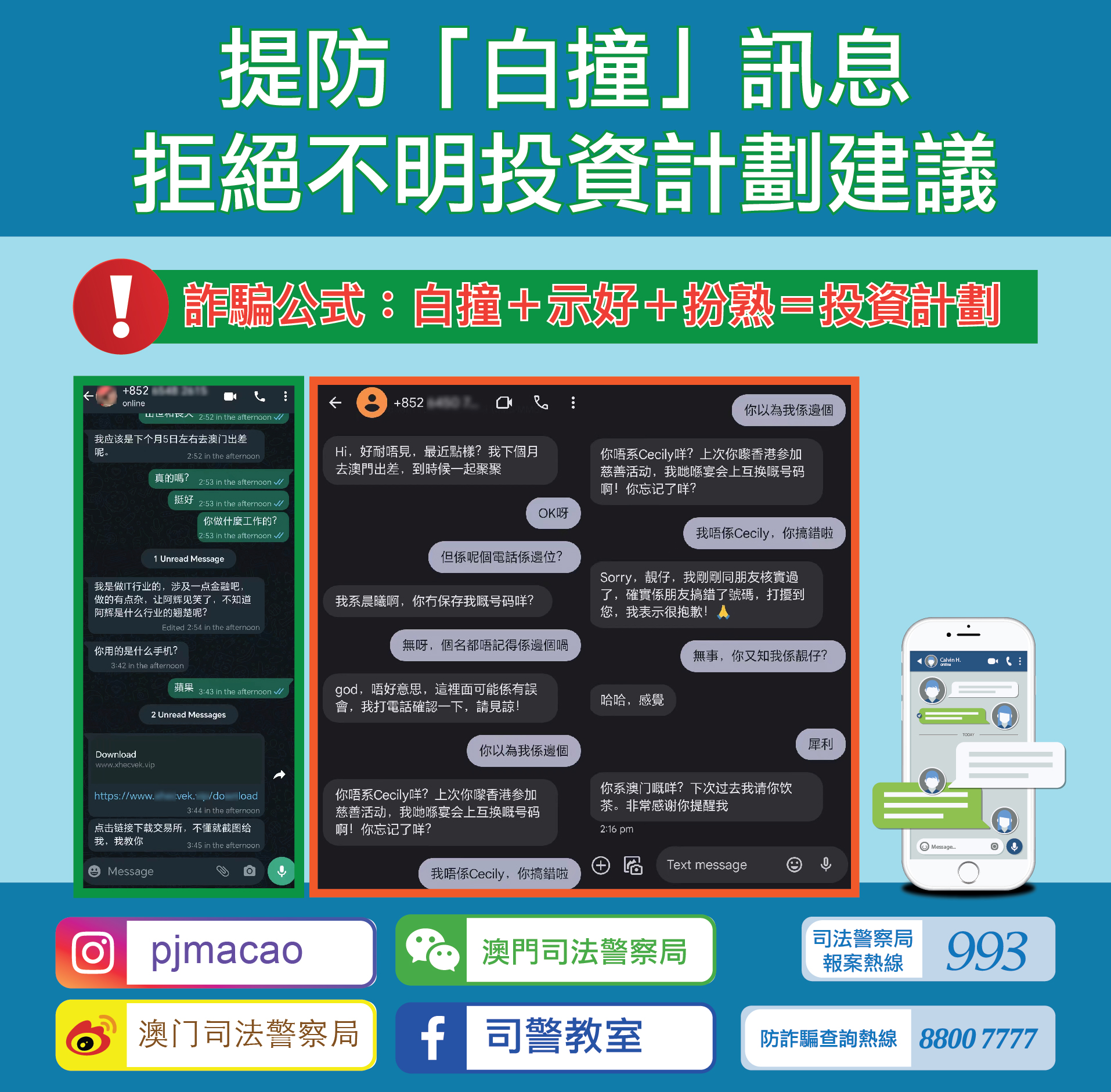 近日,司警局發現有騙徒以“白撞”方式透過手機短訊或WhatsApp通訊軟件,隨機向市民發送訊息,內容會先以熟人口吻閒聊作為開場白,隨後會聲稱“入錯號碼”、加錯好友,一旦事主回覆,對方便聲稱與事主有緣繼續閒聊,在取得信任後,便以介紹高額回報的虛擬貨幣或A股投資項目為由,邀請事主下載來歷不明的假投資App。另外,也有部分事主會被加入投資WhatsApp群組,收取“投資貼士”,結果亦被逐步游說參與虛假的投資計劃。