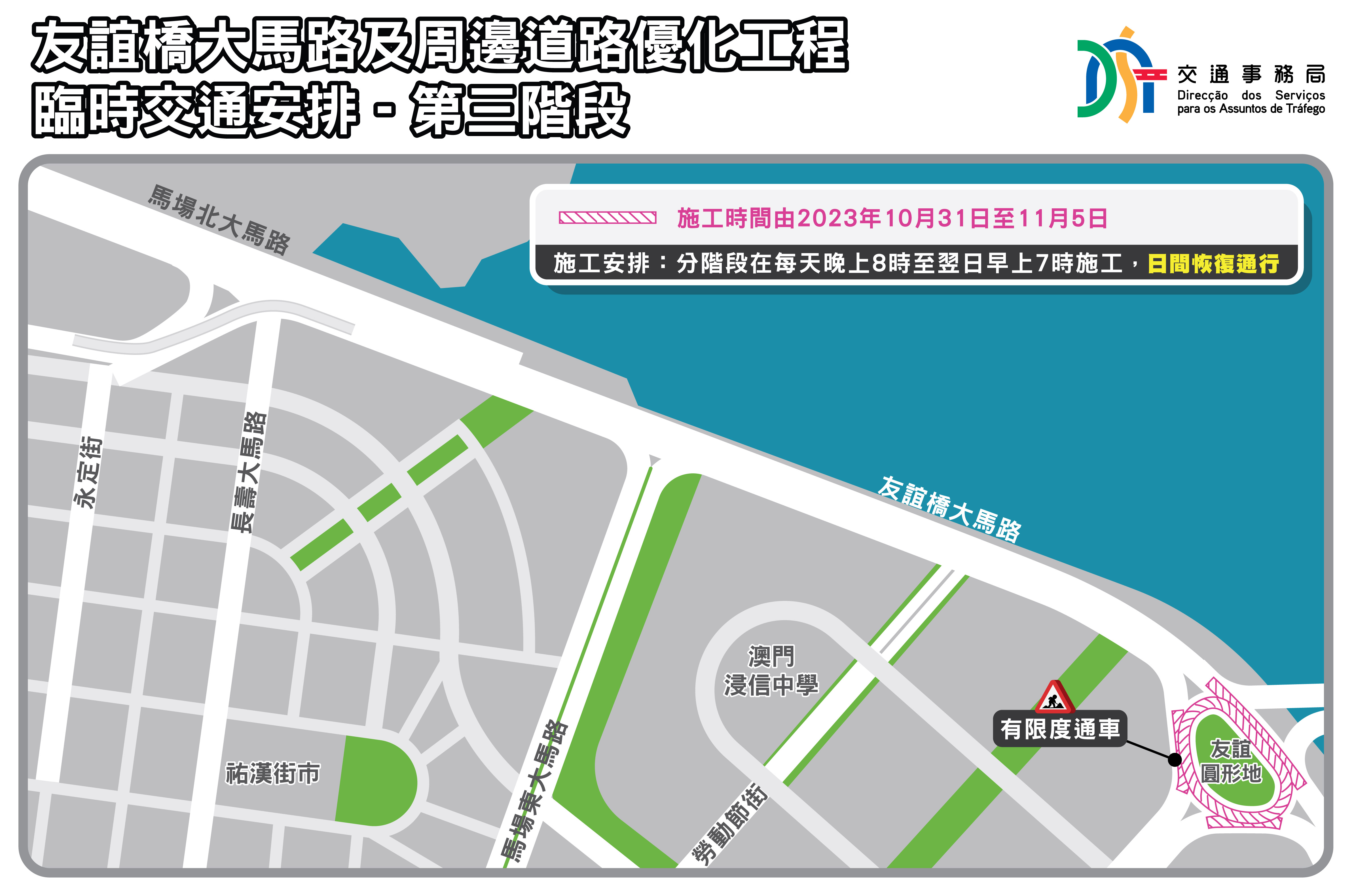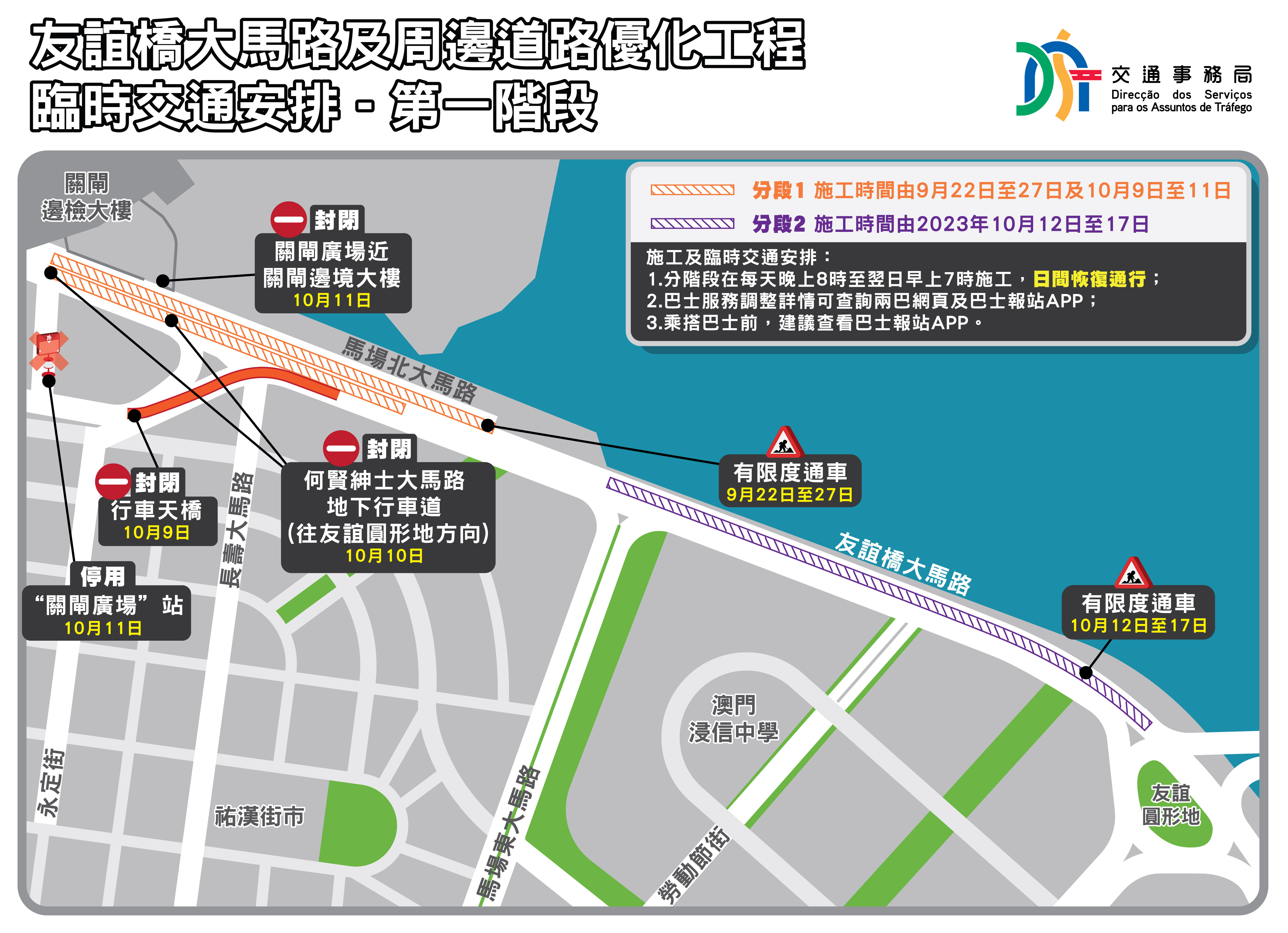市政署將於9月22日起分階段於友誼橋大馬路及周邊道路進行路面重鋪工作,為盡量減低對市民及周邊交通影響,工程將安排於晚上8時至早上7時進行,工程採用新型瀝青,並實施即刨即鋪,日間路面可全線開放,到晚上再實施有限度通車,工程期間有臨時交通安排,敬請市民留意。另因應國慶黃金周,為避免增加區內交通壓力,9月28至10月8日將暫停施工。