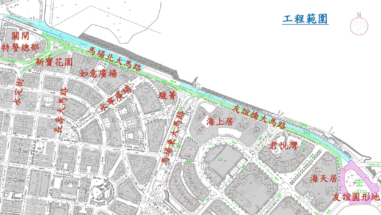 友誼橋大馬路及周邊包括:關閘廣場、馬場北大馬路及友誼圓形地等路段屬北區主要交通幹道,且有大量工程車及旅遊巴等重型車輛使用,多年未有大範圍重鋪,路面已有明顯損毀及起伏不平,影響行車安全,市政署將由9月22日起分階段於有關路段進行重鋪路面,預計工期34個工作夜。