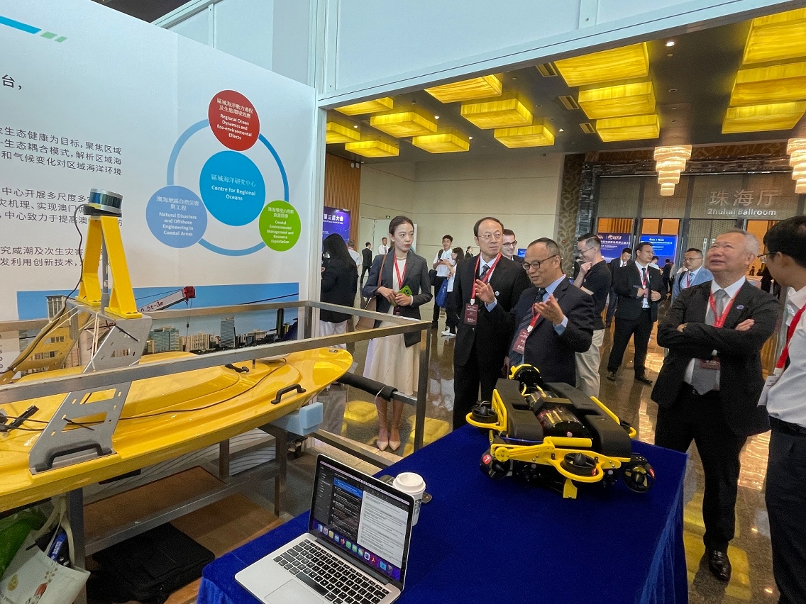 此外,澳大還受邀在開幕式暨全體大會會場設置展位,重點宣傳澳大“3+3+3+3”研究創新及轉化體系,以及科技學院海洋科學及技術系和區域海洋研究中心的建設發展情況。澳大自主研發的水上無人船(DELMAC)和智能水下航行器(ORVIS)在展會上進行了重點實物展示。DELMAC是一艘具有兩個矢量推力發動機的自主高速無人船,配備了包括LiDAR在內的大量先進傳感器以及用於導航和控制的船載即時系統。它可以服務於淺水區域(比如澳門)的智慧聲學測深。ORVIS是一種自主水下航行器,用於淺水作業、水下結構檢查、海洋生物多樣性研究、人類對海洋環境影響評估、有毒洩漏檢測和定位等。