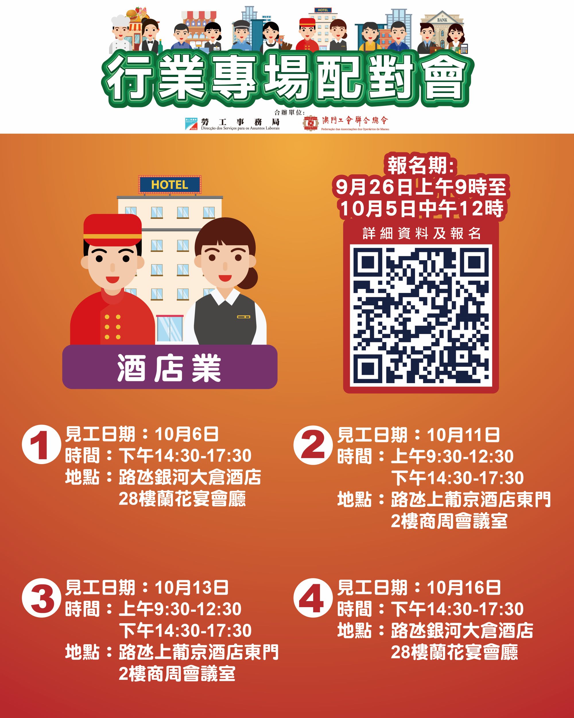 上述10月6日及10月16日酒店業配對會在澳門大倉酒店28樓蘭花宴會廳舉行;10月11日及10月13日酒店業配對會在澳門上葡京酒店二樓商周會議室舉行。報名日期為9月26日上午9時至10月5日中午12時。