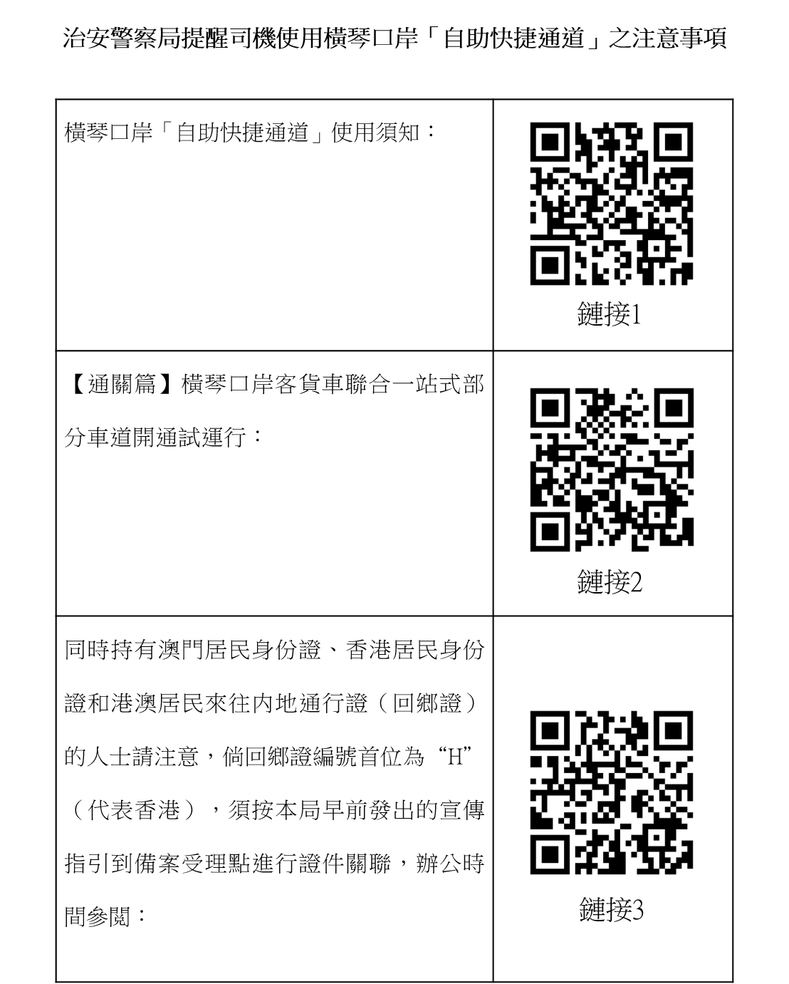 經對近日車道通關情況進行分析,發現無法經「自助快捷通道」通行的車輛,常見於司機的澳門居民身份證晶片損壞,又或未按本局在車道試運行前發出的宣傳指引辦妥琴澳兩地自助快捷通關備案手續(例如持用因公往來香港澳門特別行政區通行證的司機辦妥內地邊檢「一站式」備案手續後,未到本局受理點辦理澳方備案),導致須倒車改用「人工通道」,從而影響通關效率。因此,治安警察局再次提醒: