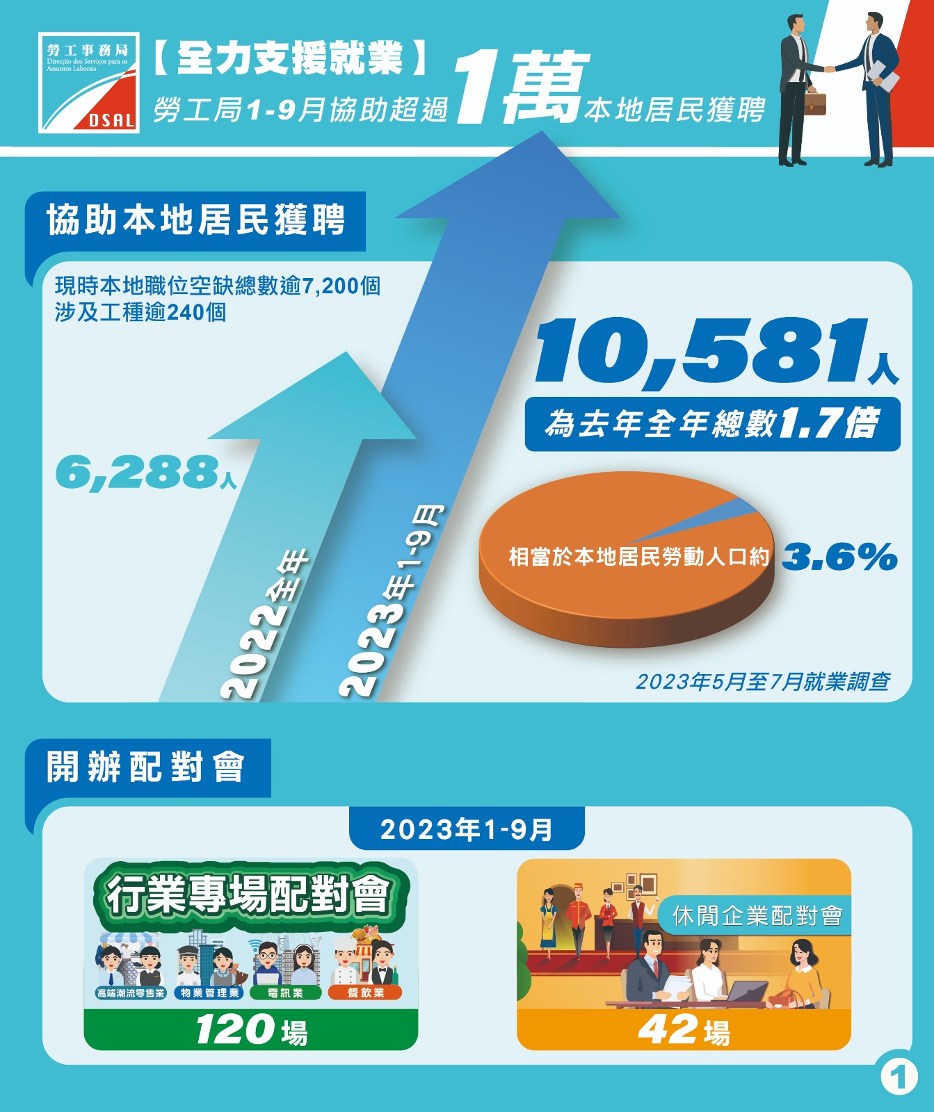 勞工局本年1月至9月合共協助10,581人成功就業,為去年全年透過勞工局成功就業總人數(6,288人)的1.7倍,相當於今年5月至7月就業調查中本地居民勞動人口約3.6%。根據勞工局網站內"本地職位空缺"資料顯示,職位空缺總數近7,200個,涉及逾240個工種,職位空缺供應充足。