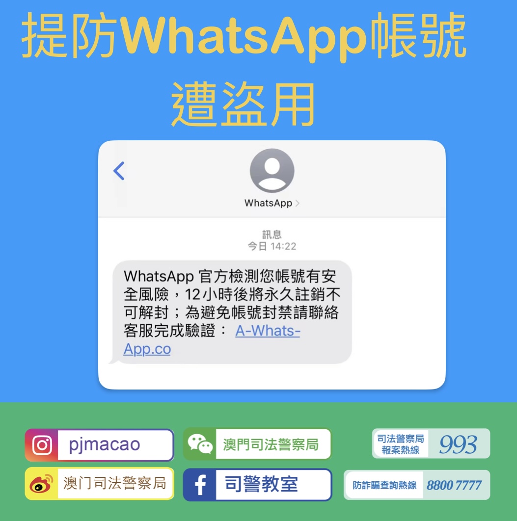 近日司警局接獲多名市民舉報,他們分別報稱日前收到親友的致電或當面查詢,才得知其WhatsApp帳號曾向不同親友發出多個借款訊息,始知帳號遭盜用。