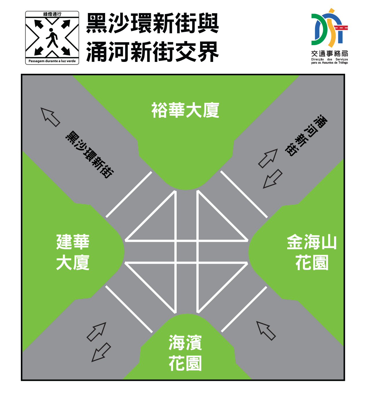 交通事務局持續檢視和優化本澳行人過路環境,經分析黑沙環新街的道路條件、過路環境及車輛通行壓力後,局方將在黑沙環新街與涌河新街交界在現有交通燈號控制下,增設斜行式過路設施。有關設施於10月11日(周三)上午完成地面標線及相應配套工作後正式啟用。