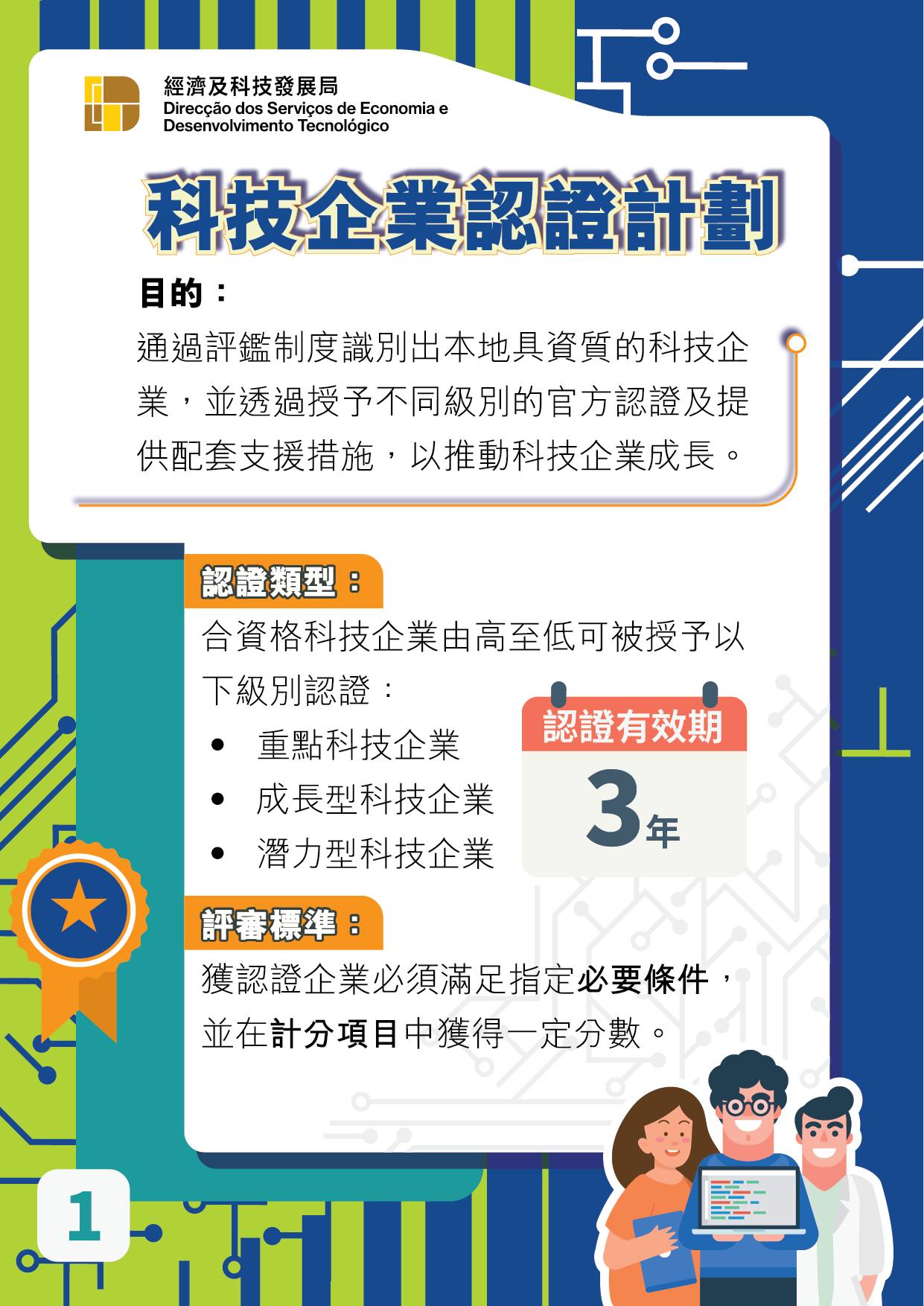 《科技企業認證計劃》每年5月及11月開放申請,按評審結果由低至高依次對合資格企業授予“潛力型科技企業"、“成長型科技企業"或“重點科技企業"的認證資格。通過評鑑制度識別出本地具資質的科技企業,配合支援配套措施,鼓勵科技創新及支持高新技術產業發展,以及吸引科技企業落戶澳門。
