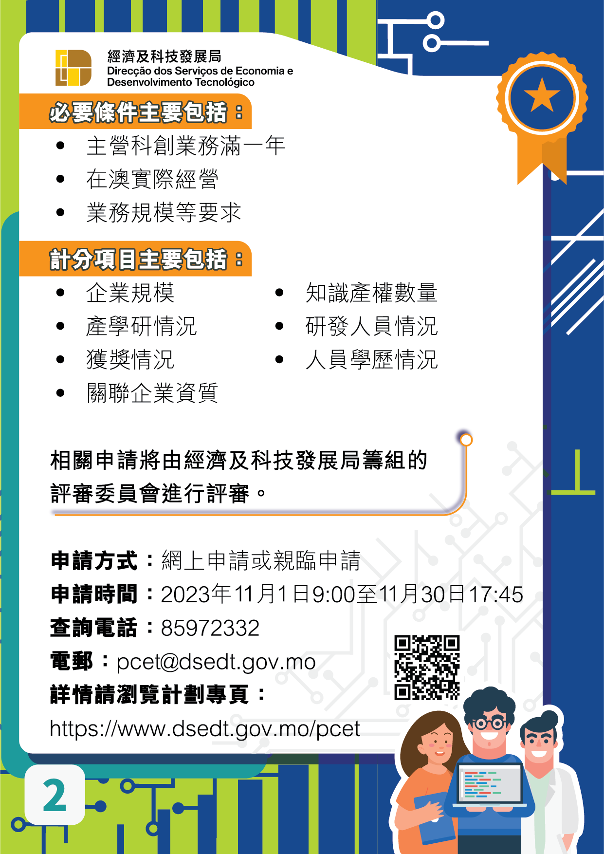 本年度第二輪申請期為11月1 日至30日,申請者可透過經科局網上系統提交申請。有關獲認證企業名單以及計劃申請詳情,可瀏覽計劃專頁(https://www.dsedt.gov.mo/pcet),或致電8597 2332查詢。