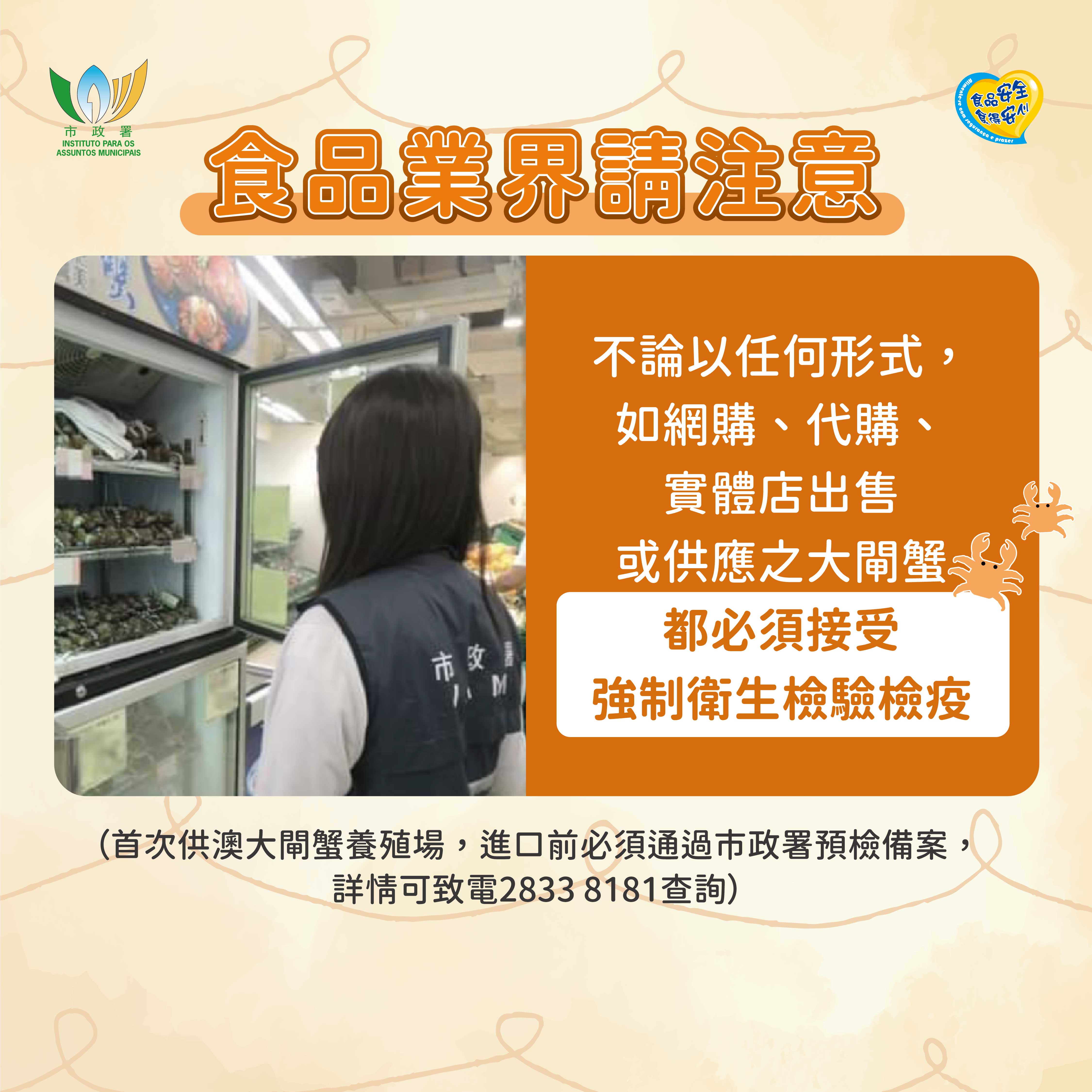 市政署持續透過嚴格的入口檢驗檢疫制度及市場巡查機制,對入口並在本澳銷售的鮮活食品作嚴格把關。市政署持續與內地權限部門保持緊密聯繫,對供澳大閘蟹的品質及安全,採取源頭監管及預檢措施。大閘蟹養殖場正式供貨到澳門前,須通過市政署預檢,並由來源場監管當局直接封簽才可輸澳。而大閘蟹抵澳後亦須提交由產地官方發出之衛生證明文件以及相關衛生檢疫資料供審核,並接受常規抽樣,經檢驗檢疫程序後才得以流入本澳市場。