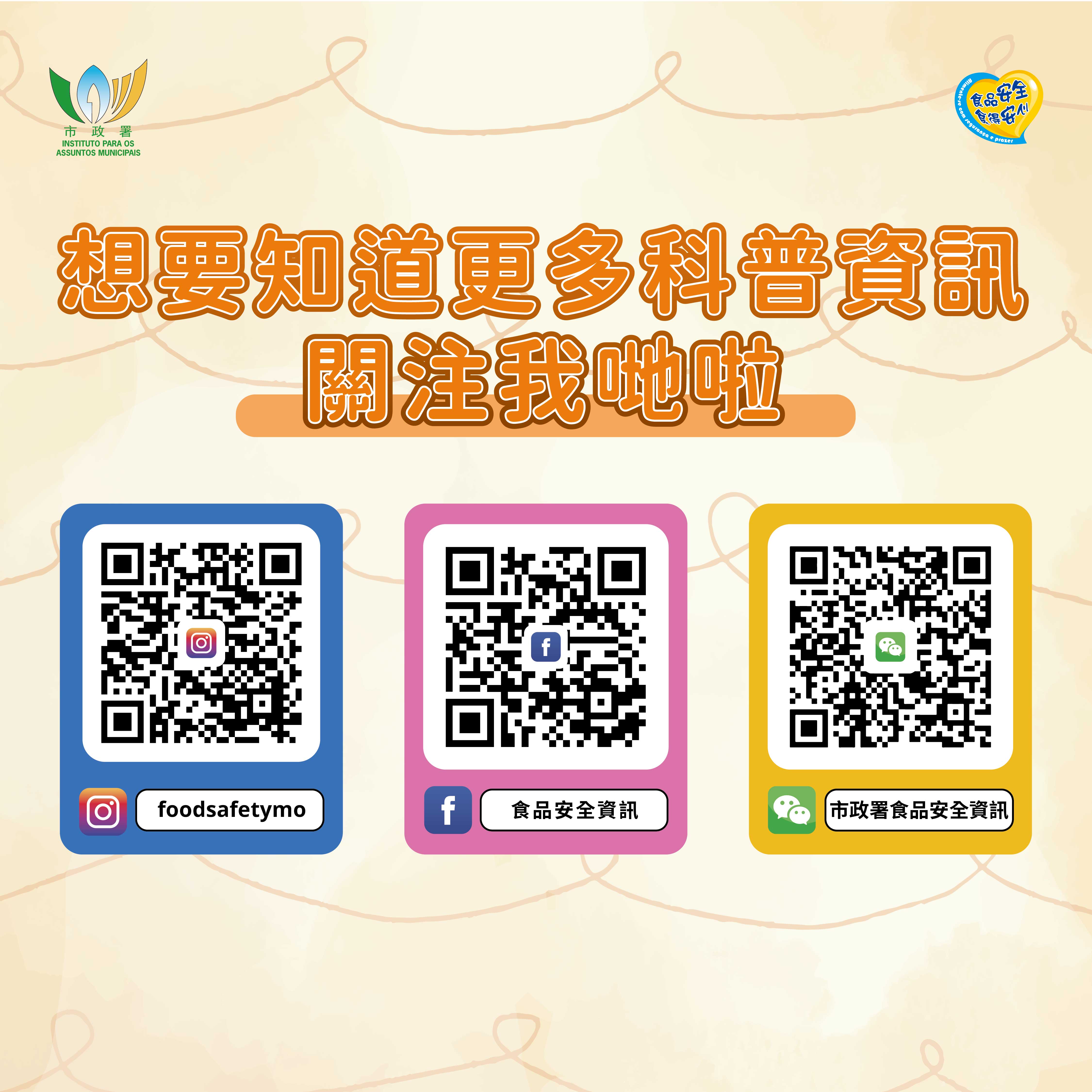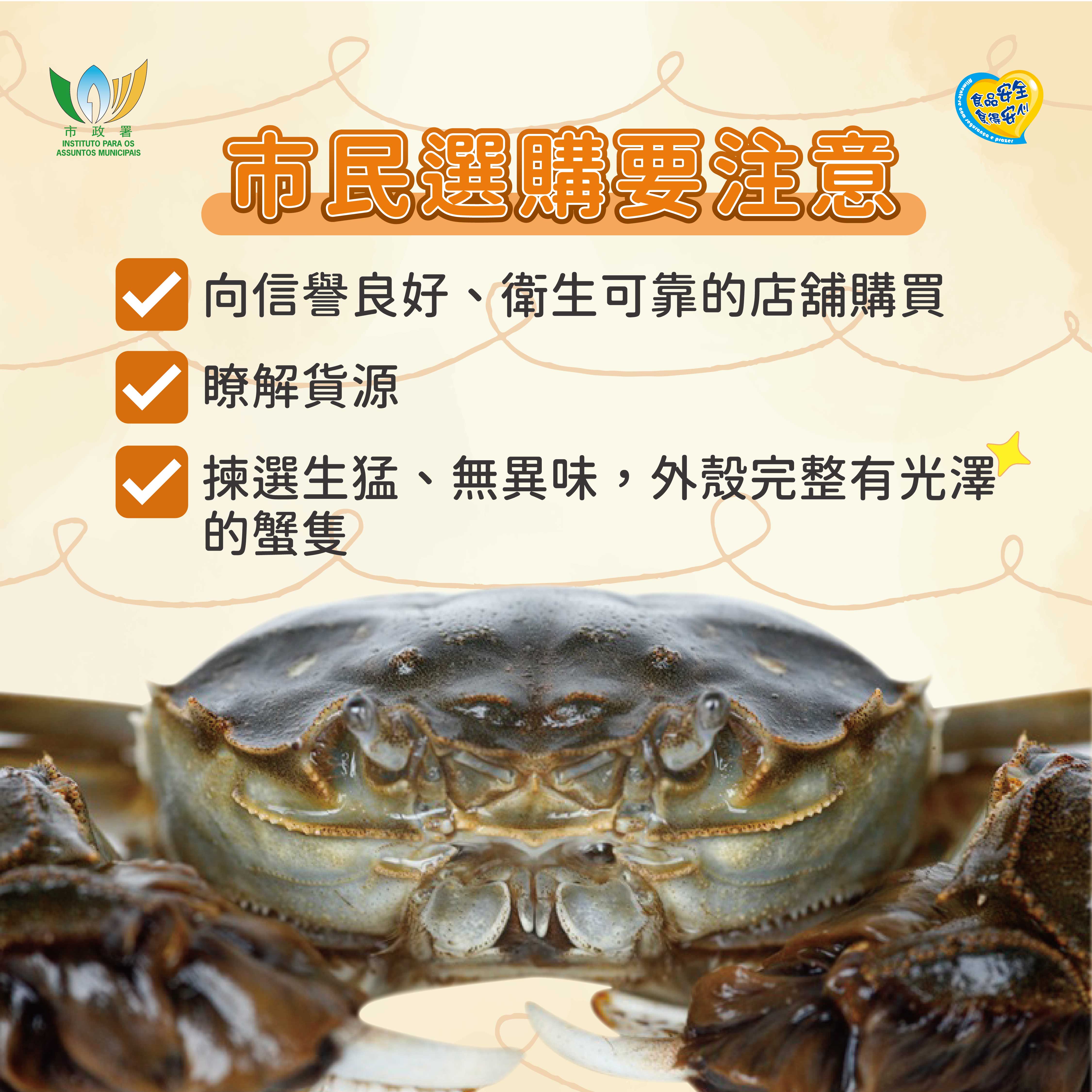 市政署提醒消費者,應向信譽良好及衛生可靠的店舖選購大閘蟹,並須清楚貨品來源。選購大閘蟹應以生猛、外殼完整有光澤、沒有異味為佳,進食前必須徹底煮熟。一旦蟹死亡,容易滋生大量微生物,不宜繼續烹煮食用。另外,市政署已開通“市政署食品安全資訊”微信訂閱號、Facebook專頁及Instagram帳號,並會因應季節性食安風險、社會關注的食安主題等,提供各類食安科普及風險提示資訊,歡迎市民關注。