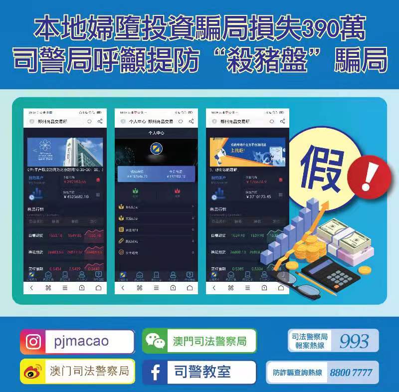 司法警察局於今日接獲舉報,指有市民透過K歌聊天軟件認識到一名自稱“國家軍人團長”的人士,事主在對方多次教導下進行網上投資,最終發現無法提現始知被騙,報稱損失約390萬澳門元。