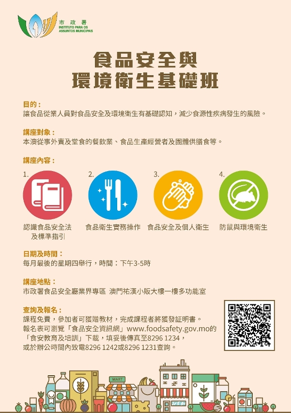 市政署持續為本澳業界提供系統性的食安培訓課程,提升食安認知及操作水平。十月份“食品安全與環境衛生基礎班”及十一月份“食品衛生督導課程”現正招生,歡迎業界踴躍報讀。