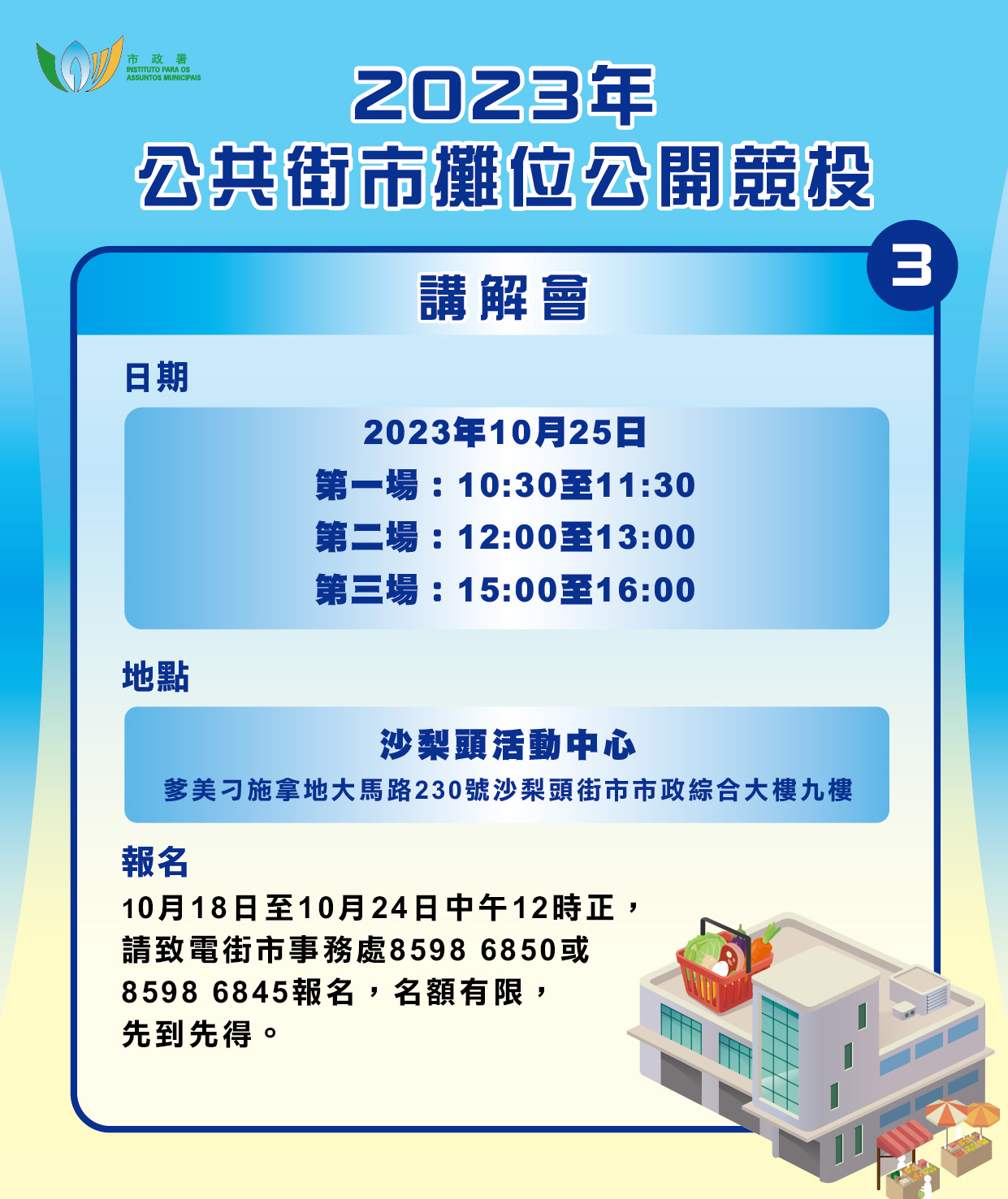 為了讓有意投標者更好地瞭解相關程序、正確填寫公開競投申請表、撰寫競投計劃書應注意事項,市政署將於十月二十五日在沙梨頭活動中心舉行三場公開競投講解會,時間分別為早上十時三十分、中午十二時及下午三時正,歡迎居民致電8598 6850或8598 6845報名及查詢。此外,市政署網頁www.iam.gov.mo已開通“街市攤位公開競投專題網頁”。