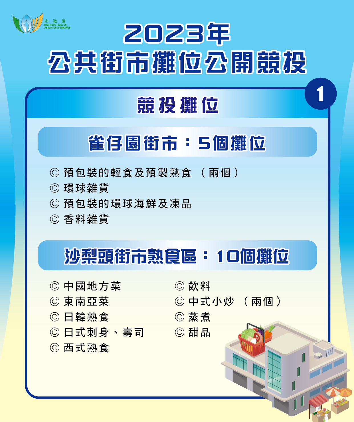 《公共街市管理制度》自2022年生效至今,街市管理整體暢順,服務質素、價格透明度、環境整潔度均有所提升。為引入積極經營者,促進街市貨品多元性,為街市可持續發展注入新活力,因應雀仔園街市和沙梨頭街市整治優化後的空間佈局和條件,市政署推出分別位於該兩個街市的十五個攤位予居民競投。有別於過去空置街市攤位以登記抽籤分配的形式,是次根據《公共街市管理制度》相關規定,以公開競投方式招攬攤位承租人。